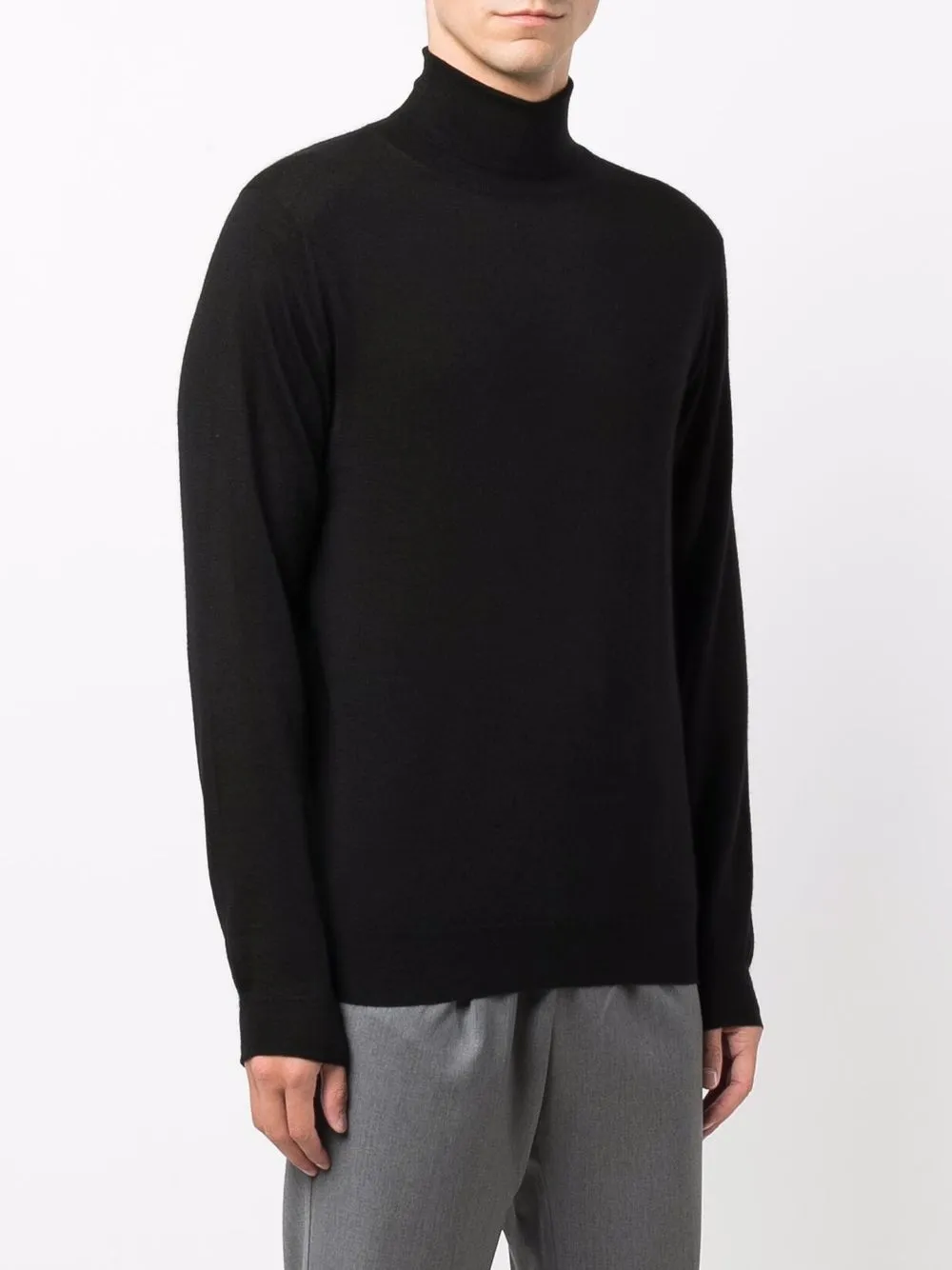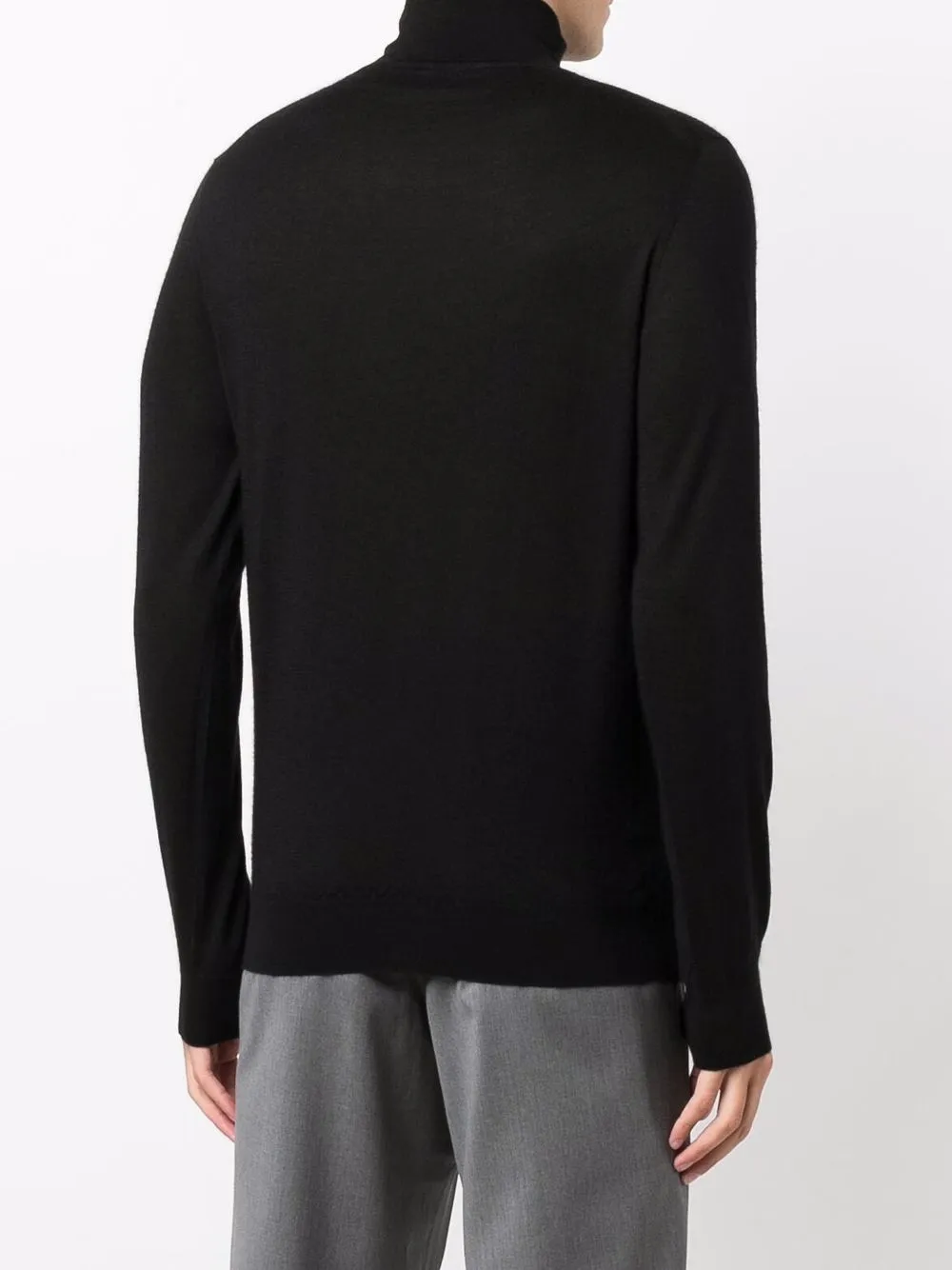 Тонкая вязка, высокий воротник, длинные рукава, манжеты в рубчик и подол в рубчик, цвет черный