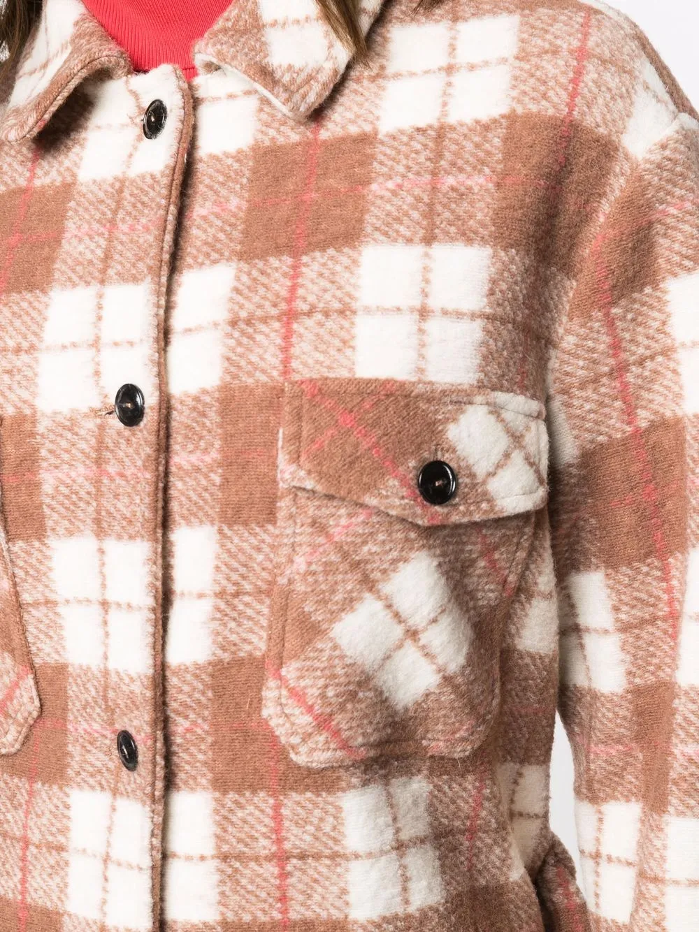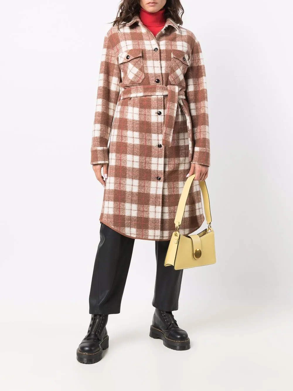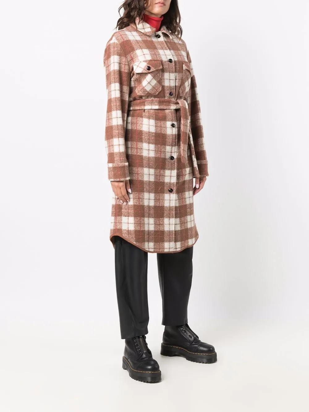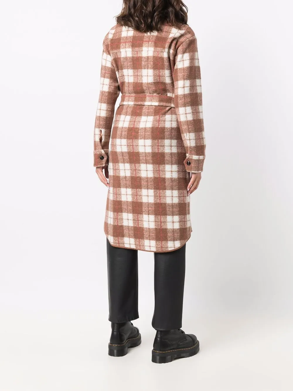 Коричневый, смесовая шерсть virgin wool, принт в клетку, застежка на пуговицах спереди, ремень на талии, длинные рукава и длинная модель