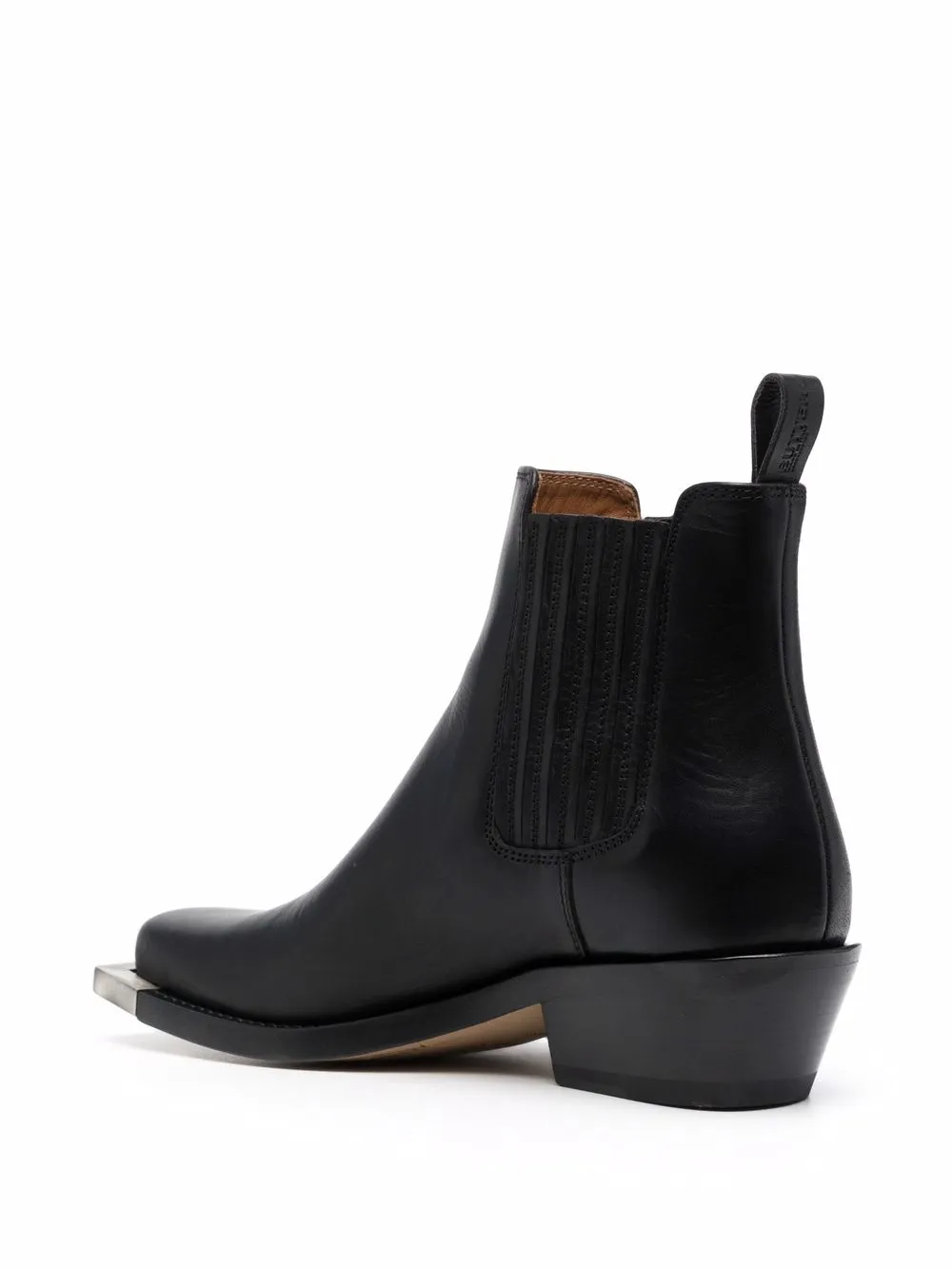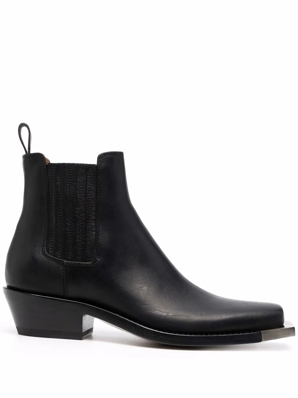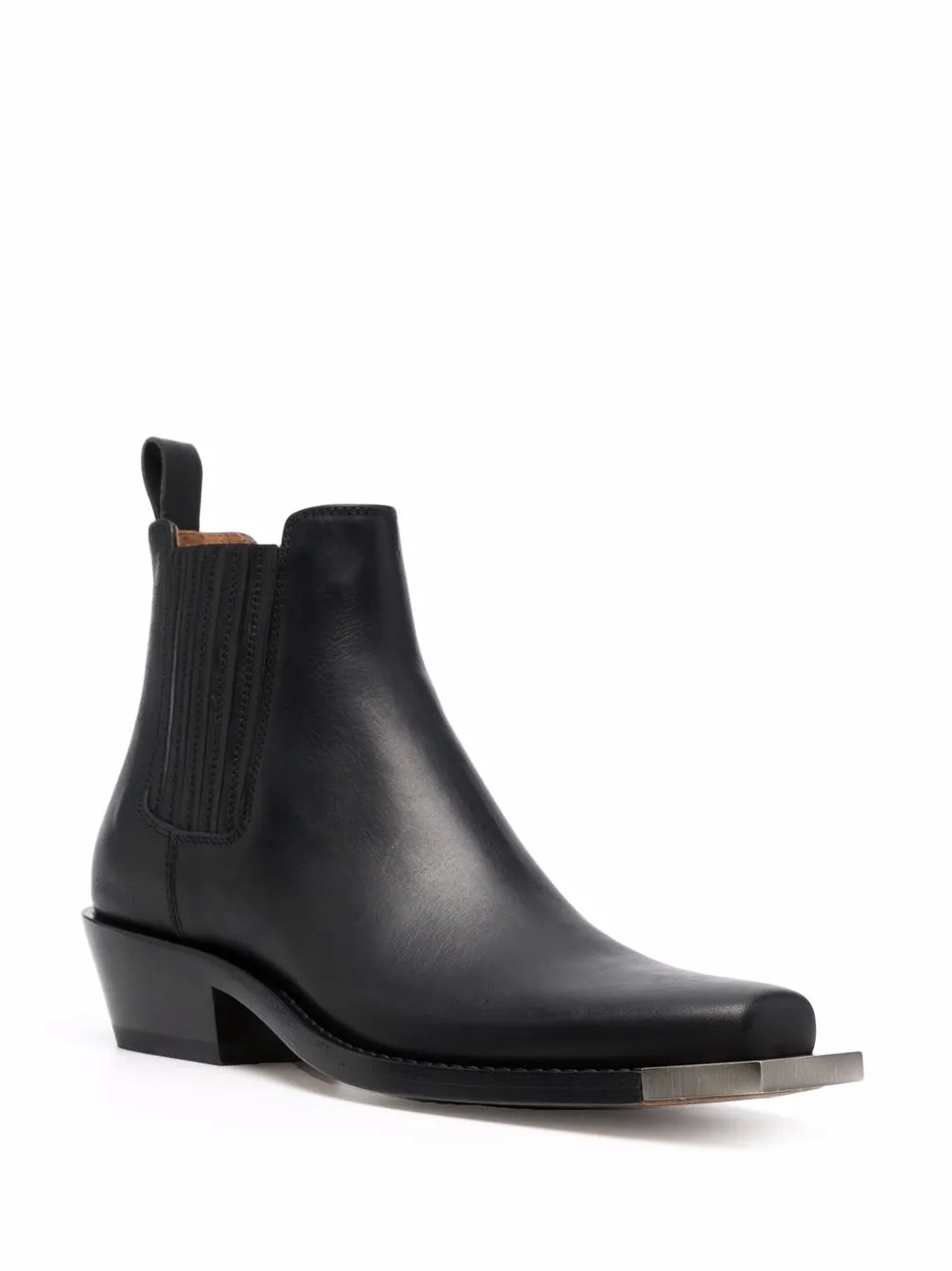 Длина по щиколотку, модель без застежки, квадратный носок, серебристая отделка и низкий каблук конической формы, цвет черный