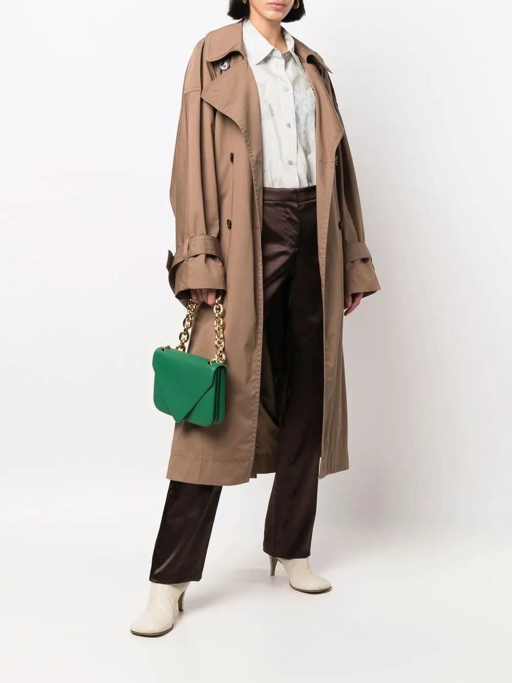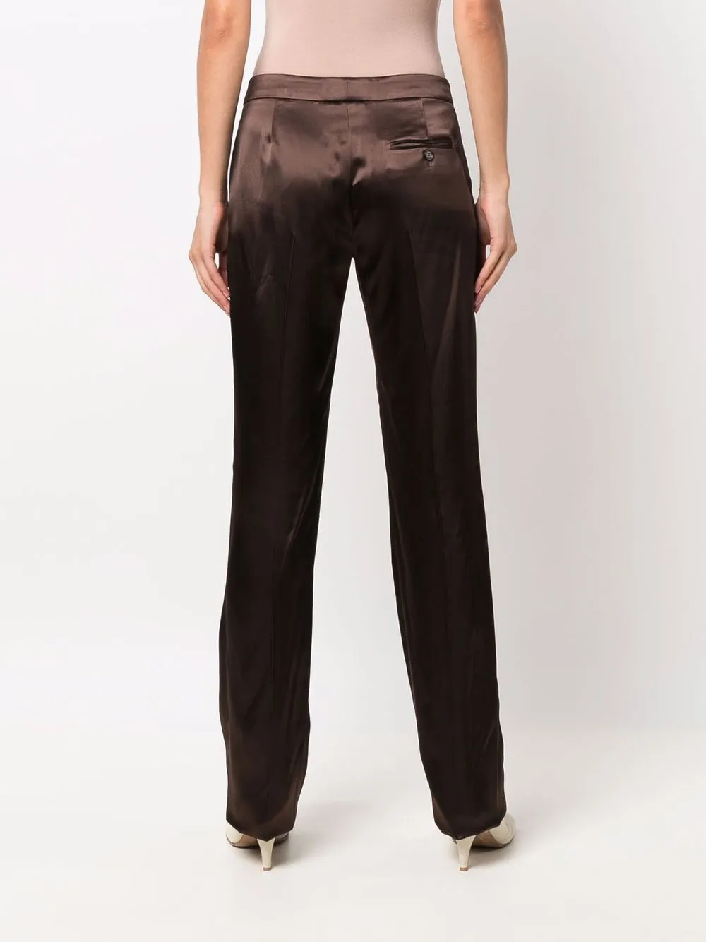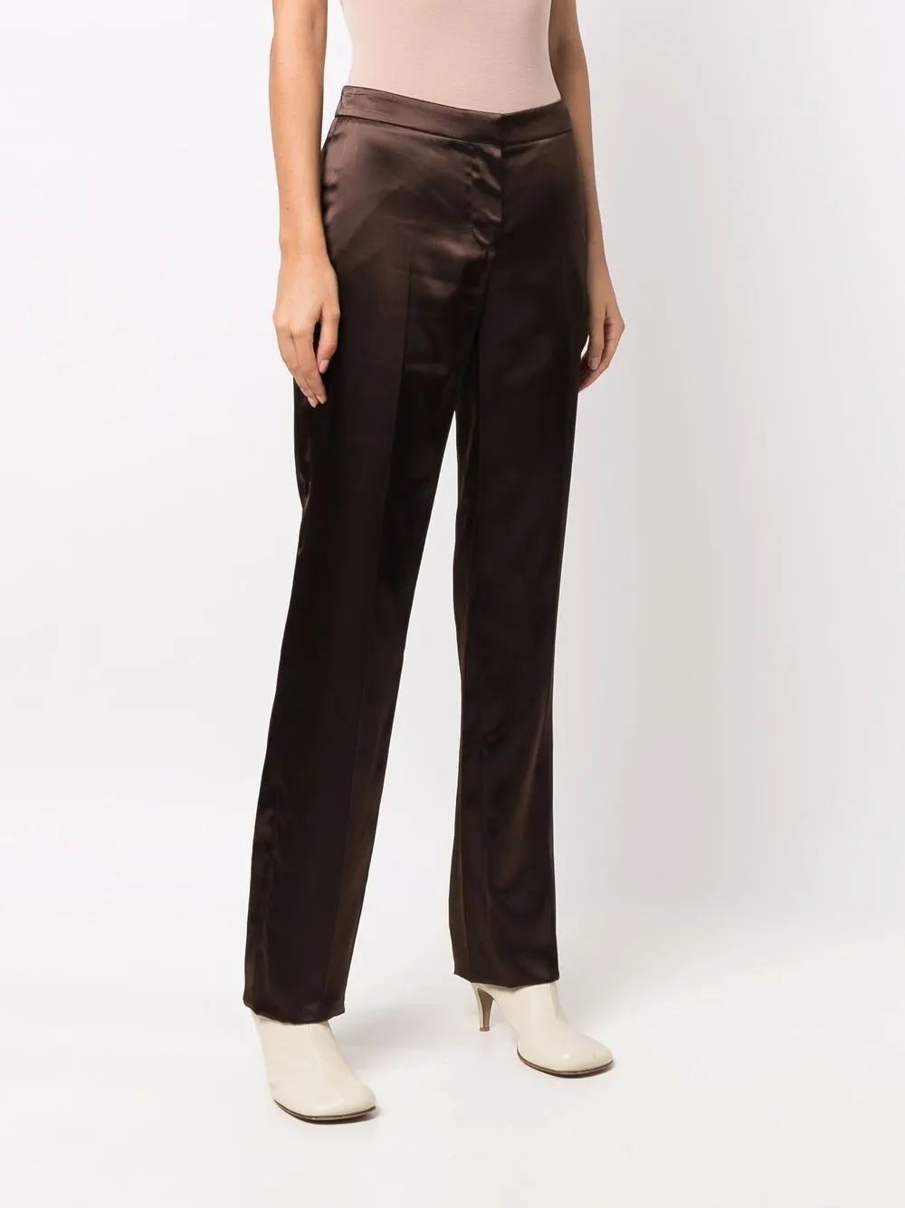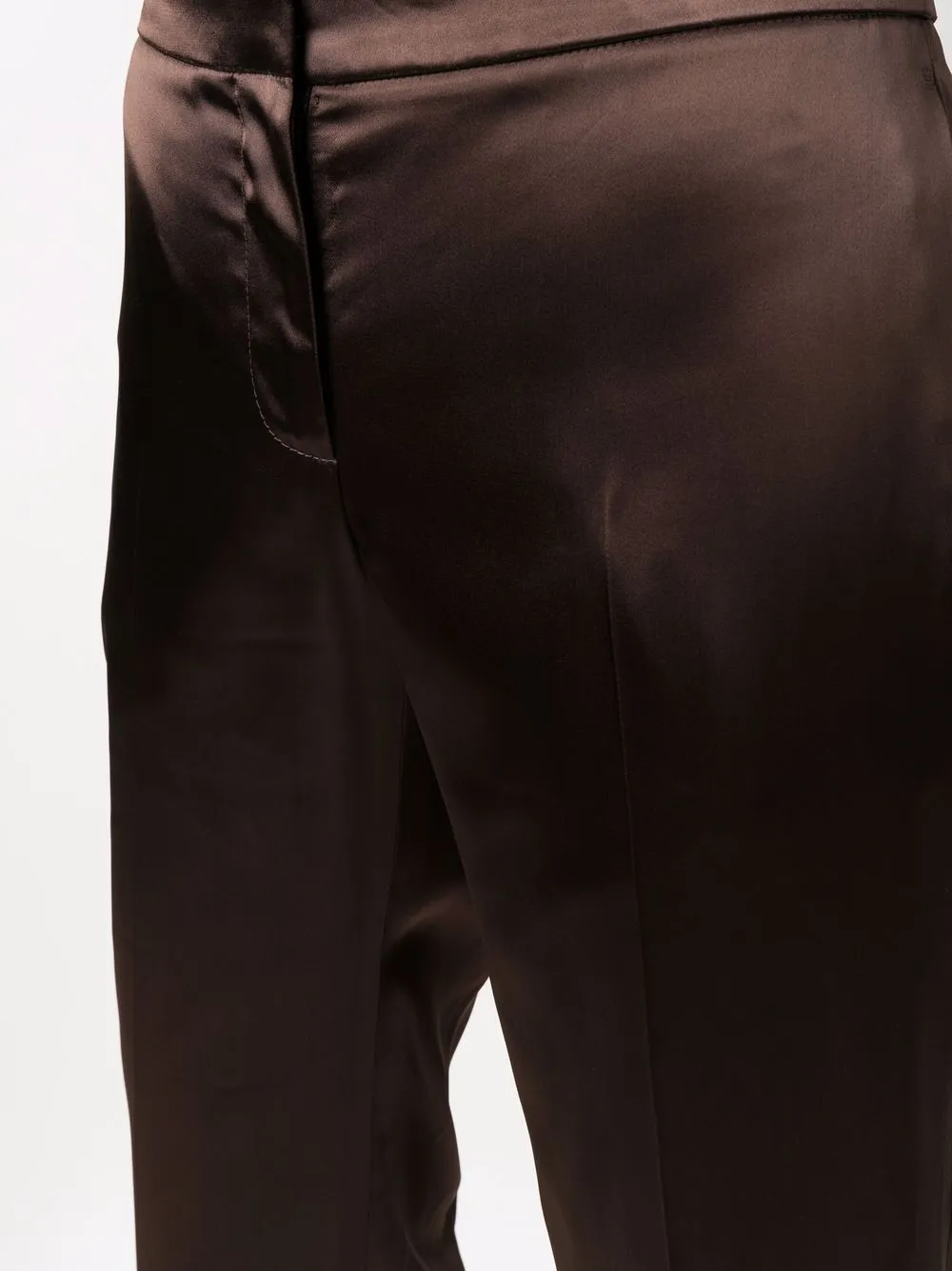Глянцевая фактура, средняя посадка, потайная застежка спереди, задние карманы с листочкой, прямой крой и длина по щиколотку, цвет коричневый