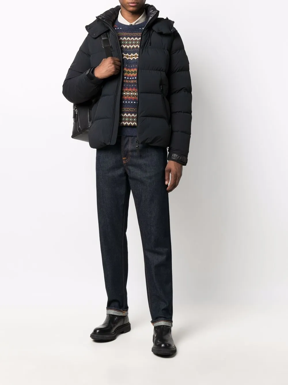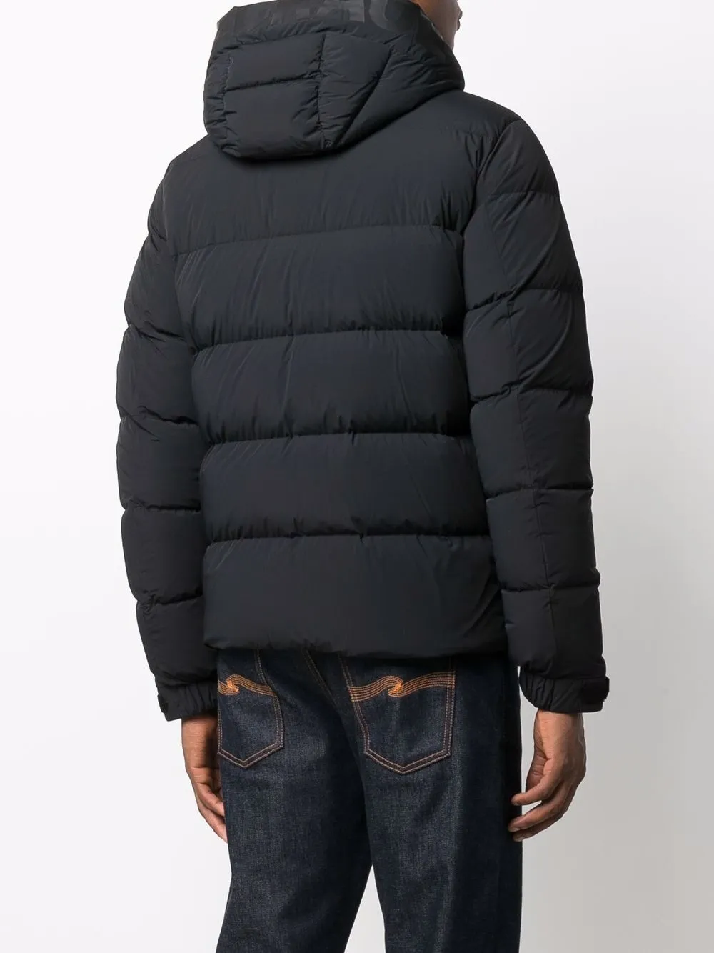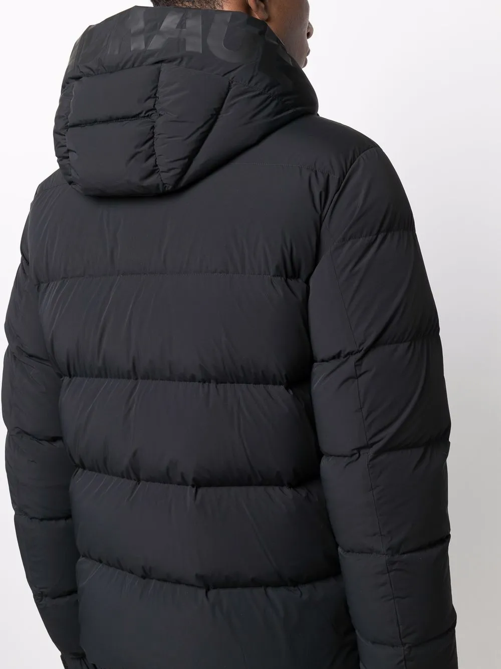 Дутый материал, дутые вставки, классический капюшон, высокий воротник, застежка на молнии спереди, передние карманы на молнии, длинные рукава и прямой подол, цвет черный