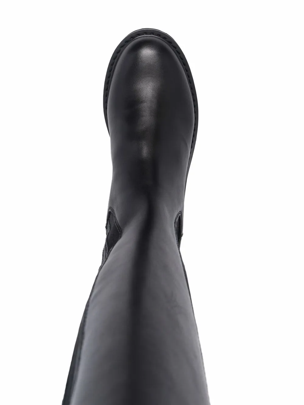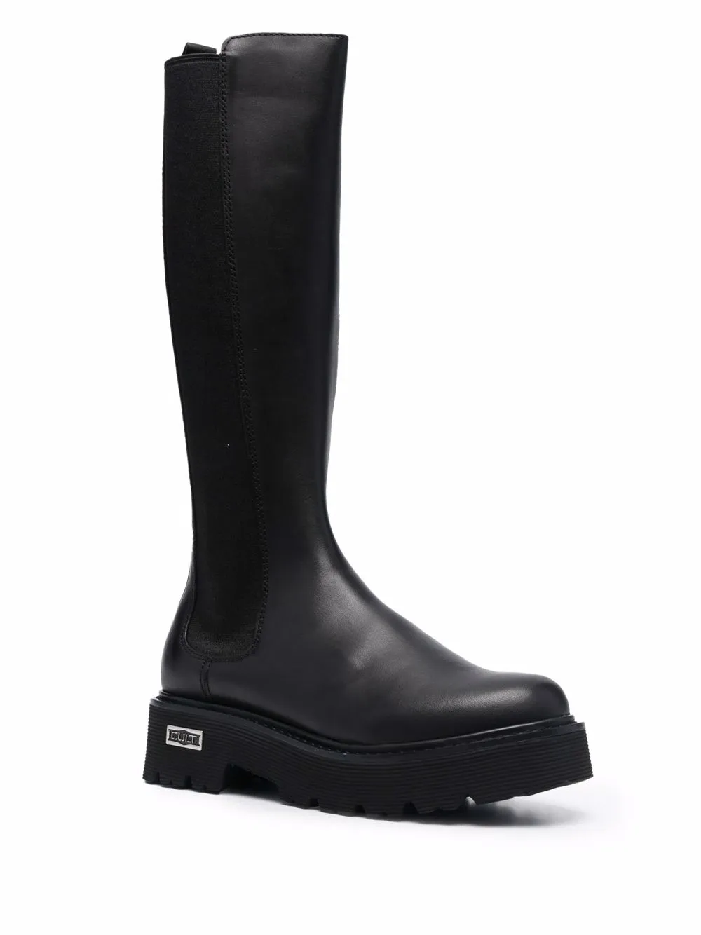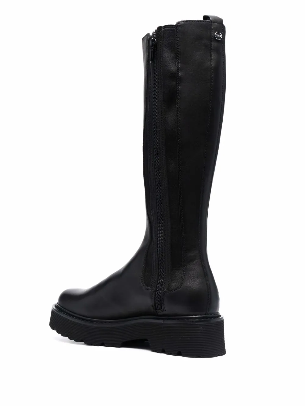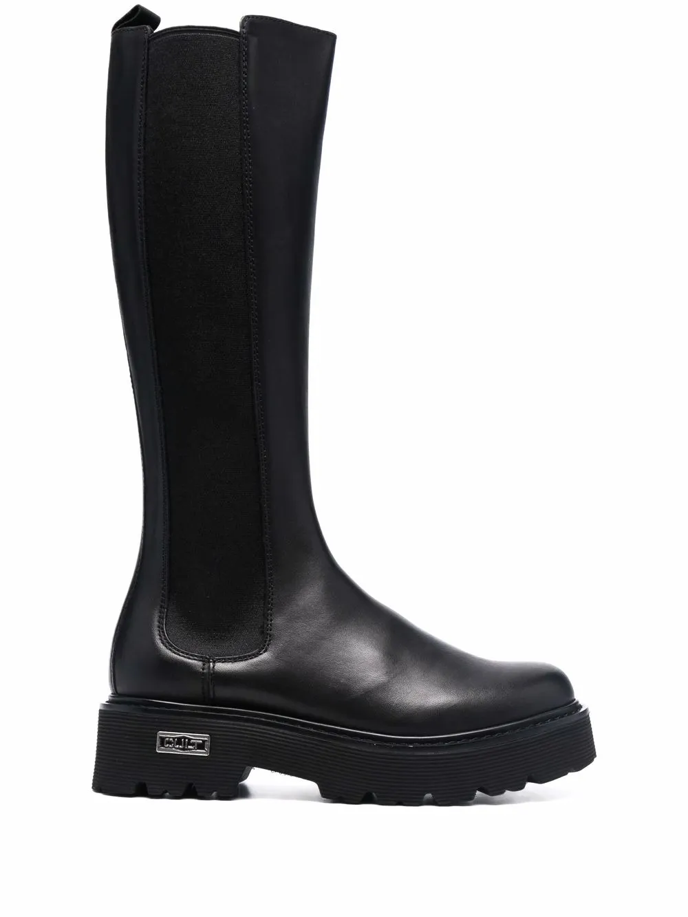 Серебристый металлический логотип, закругленный носок, эластичные боковые панели, длина по колено, петля для подтягивания сзади и массивная резиновая подошва, цвет черный