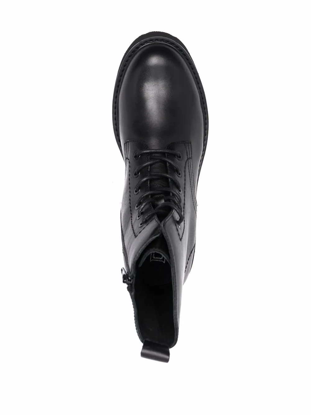 Закругленный носок, шнуровка спереди, застежка на молнии сбоку, стелька с логотипом, петля для подтягивания сзади и массивная резиновая подошва, цвет черный