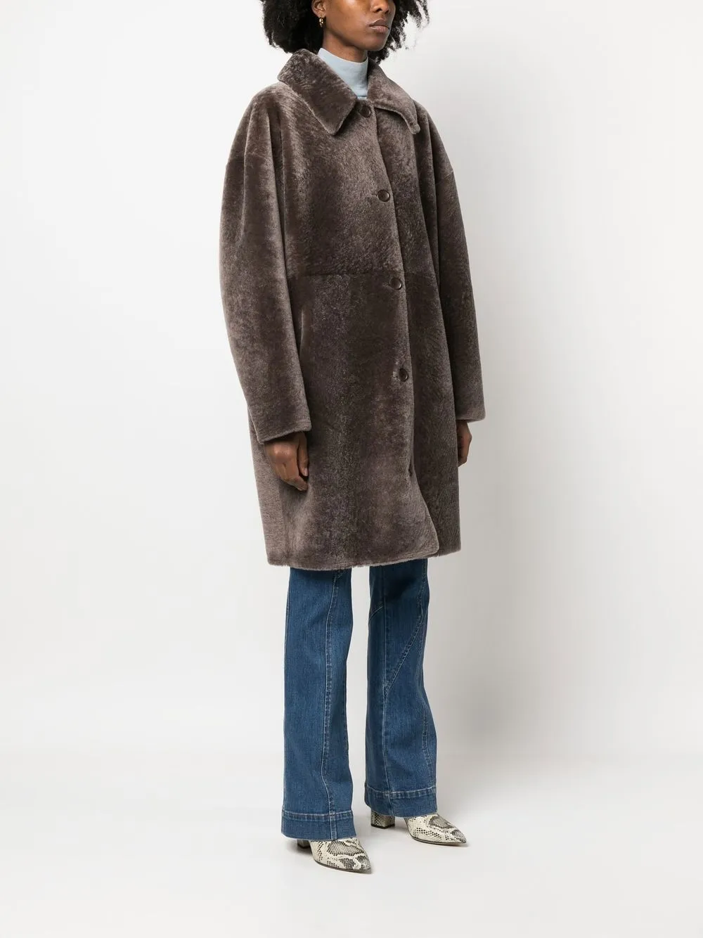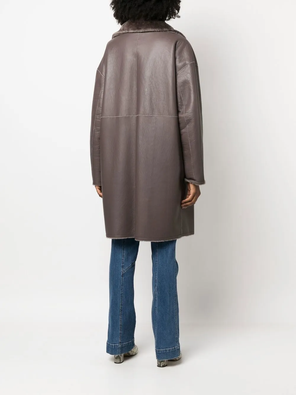 Серо-коричневый, телячья кожа, двусторонний дизайн, классический воротник, застежка на пуговицах спереди, длинные рукава, прямой подол, длина миди и два прорезных кармана сбоку