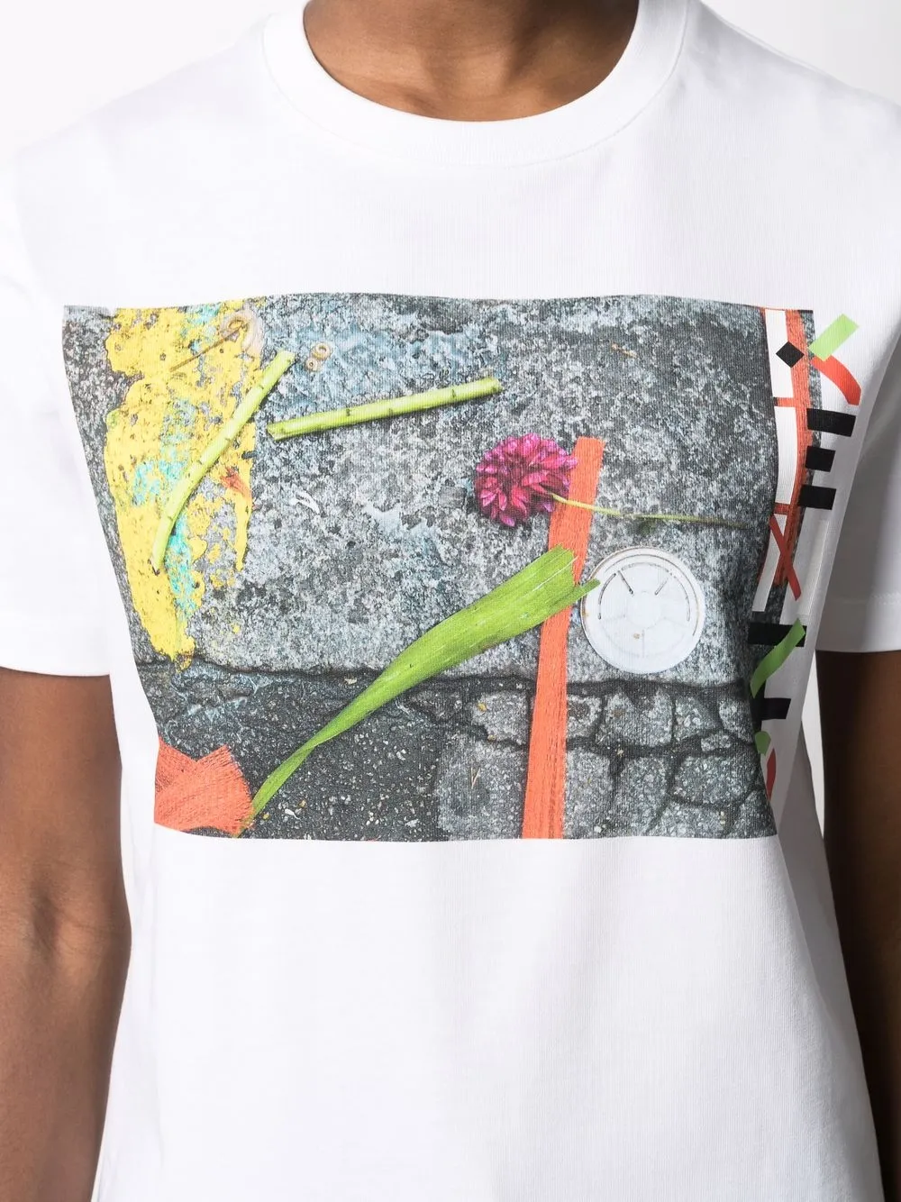 Принт на груди, круглый вырез, короткие рукава и прямой подол