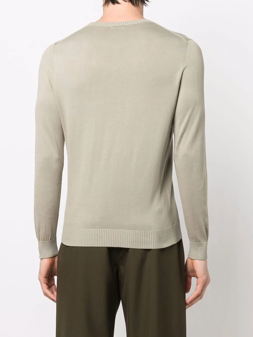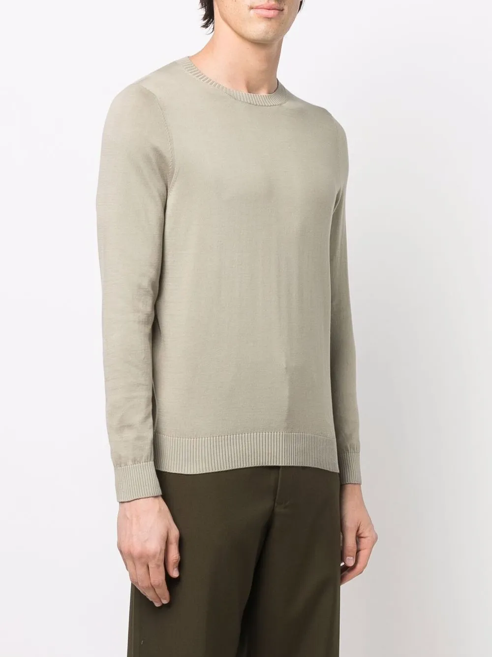 Вязаные края в рубчик, круглый вырез, длинные рукава и прямой подол, цвет зеленый