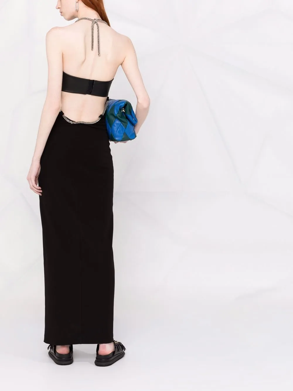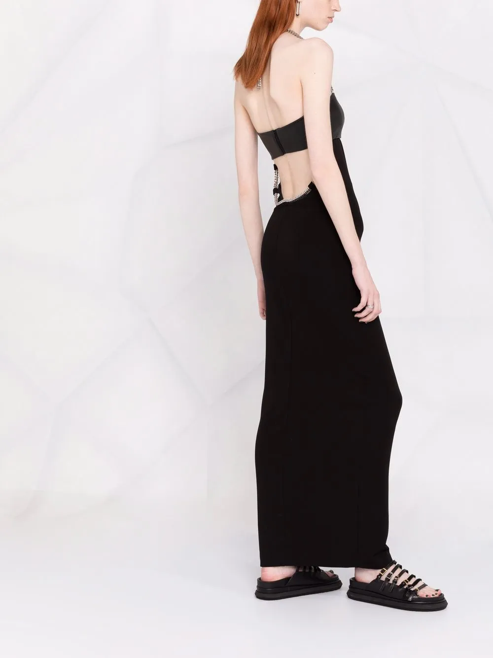 Вырезные детали, серебристая фурнитура, цепочка, вырез-петля халтер, застежка на крючок сзади, приталенный силуэт, прямой подол и длина по щиколотку, цвет черный