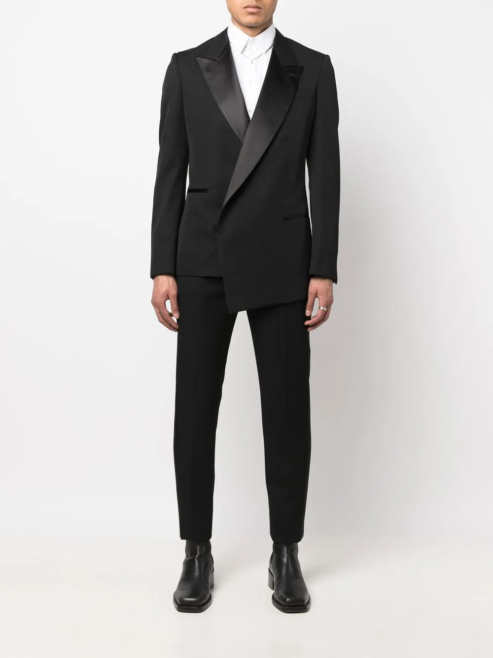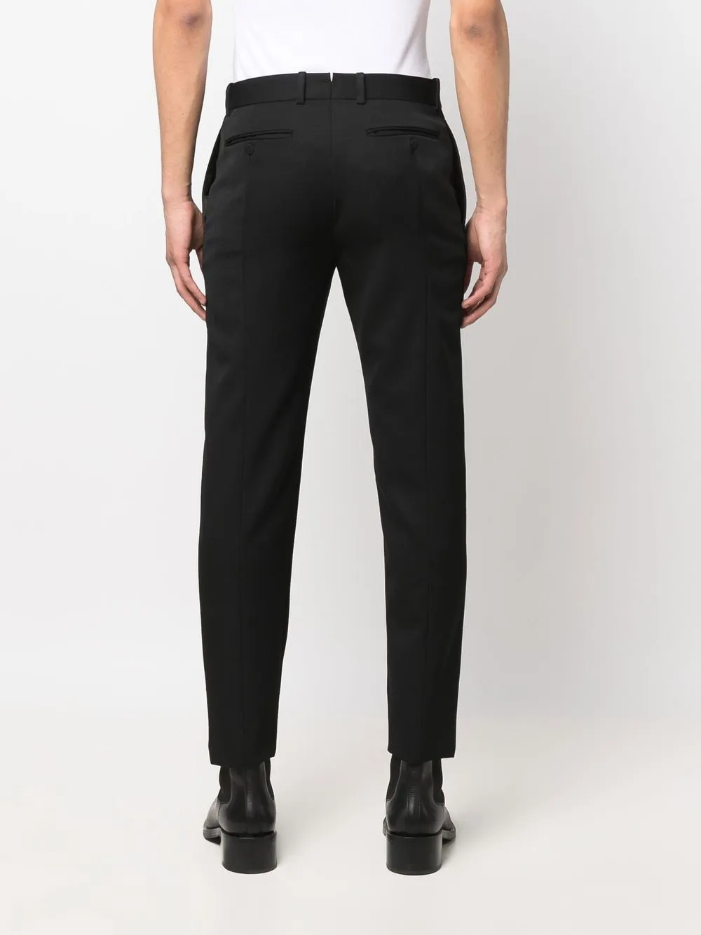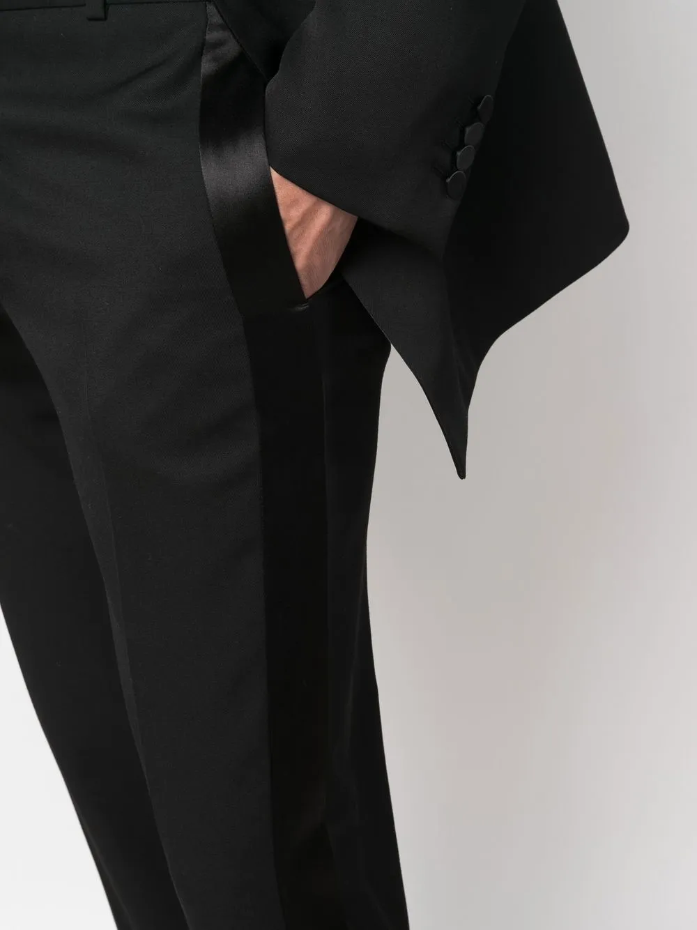 Черный, хлопок, шерсть, шелк, шелковые вставки, потайная застежка спереди, петли для ремня, два прорезных кармана по бокам, прорезной карман на пуговице сзади, узкий крой и прямой крой