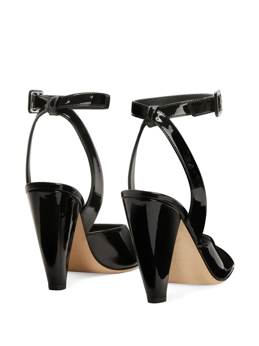 Черный, лакированная кожа, открытый носок, стелька с логотипом и ремешок на щиколотке с пряжкой