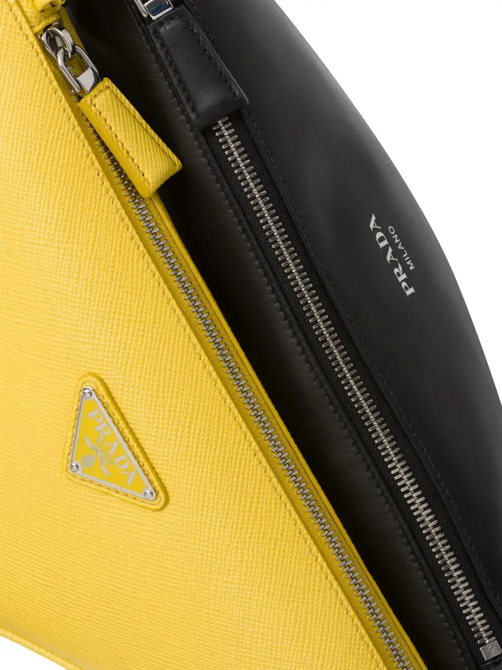 Черный, желтый, телячья кожа, сафьяновая кожа, треугольный эмалированный логотип, тисненый логотип спереди, застежка на молнии сверху, основное отделение, съемный регулируемый ремень на плечо, D-образная фурнитура и крепление для ключей.
