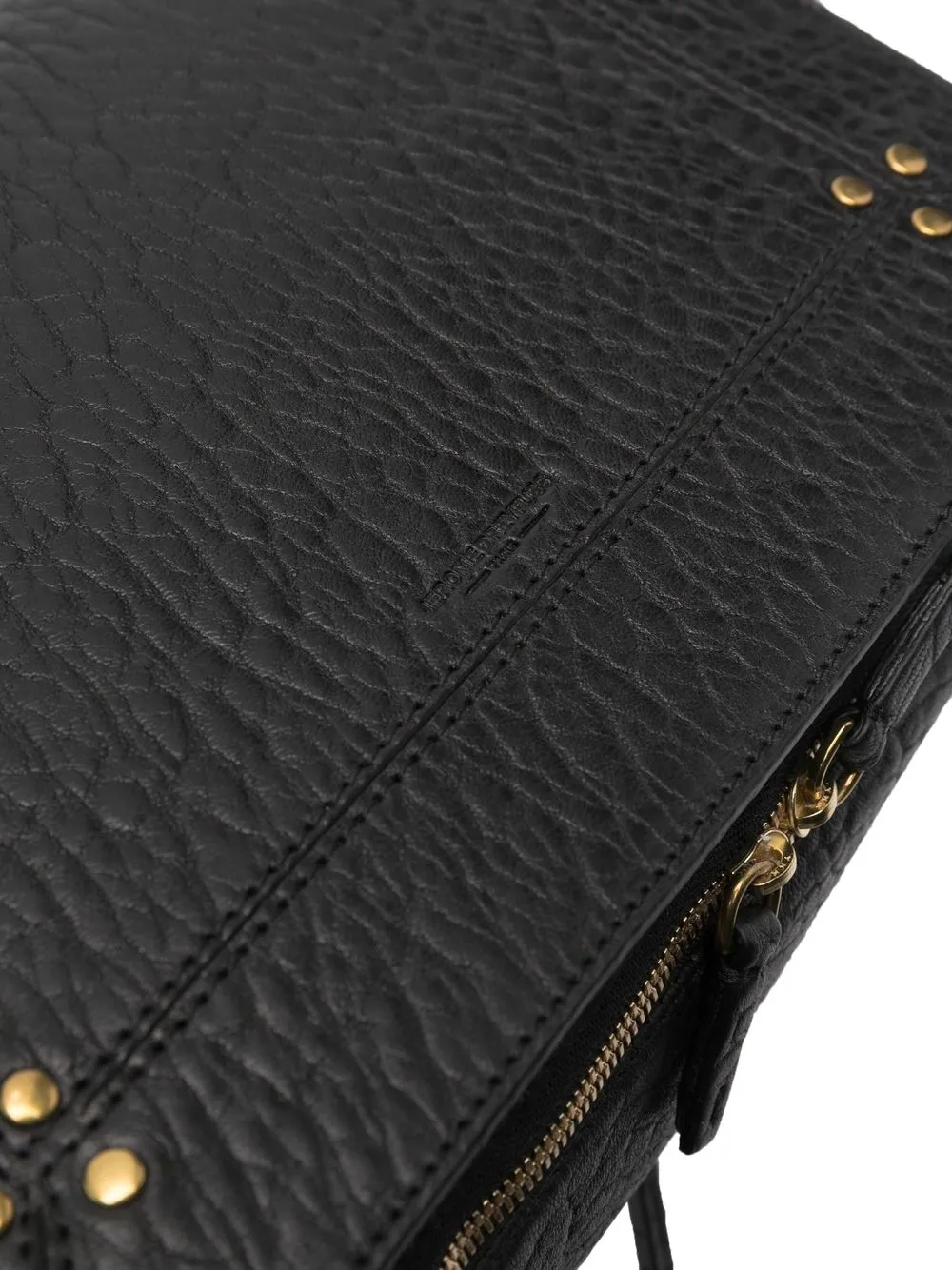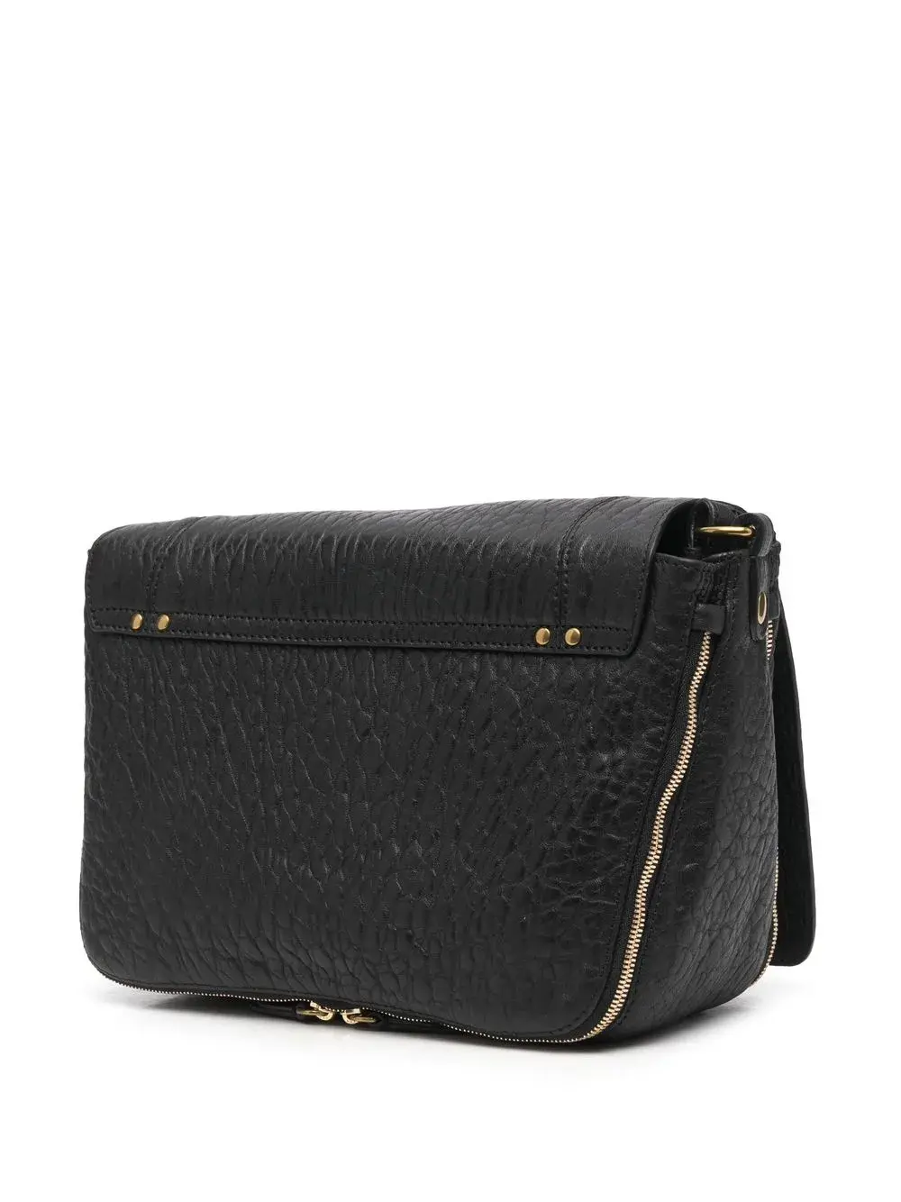 Черный, овечья кожа, зернистая текстура, тисненый логотип спереди, золотистые заклепки, застежка на молнии сверху, регулируемый ремень на плечо, основное отделение, внутренние отделения для карт и подкладка из хлопка