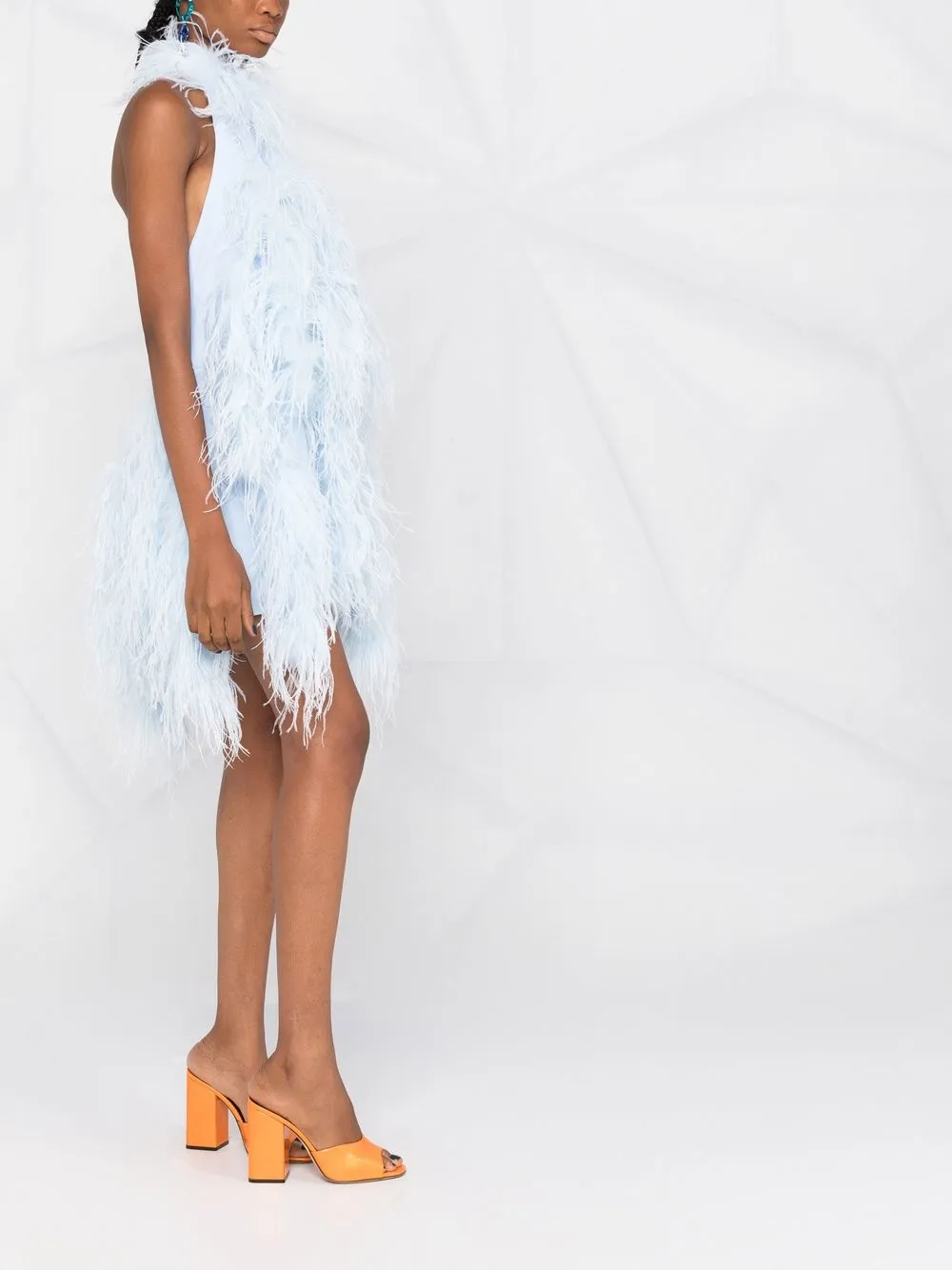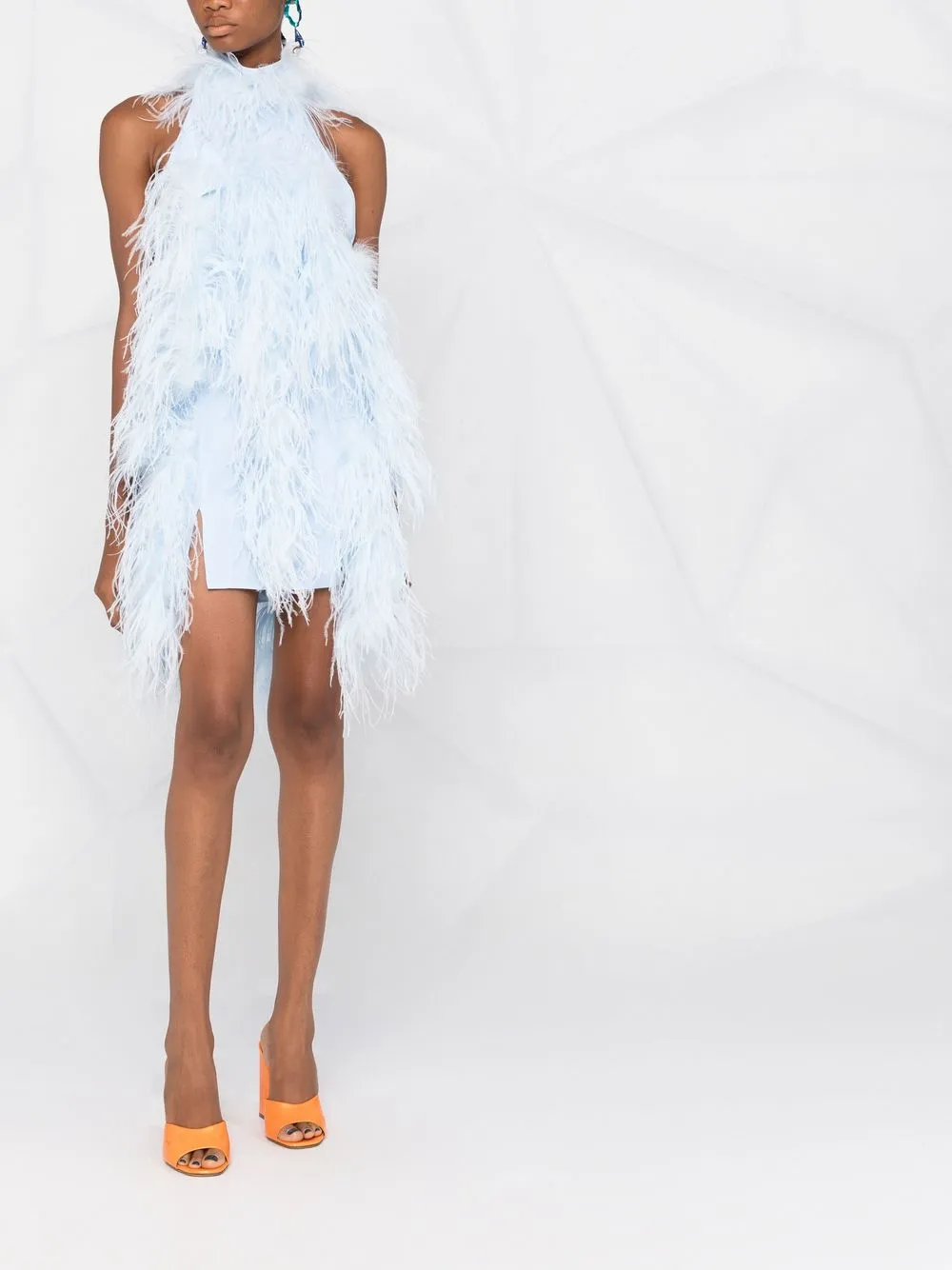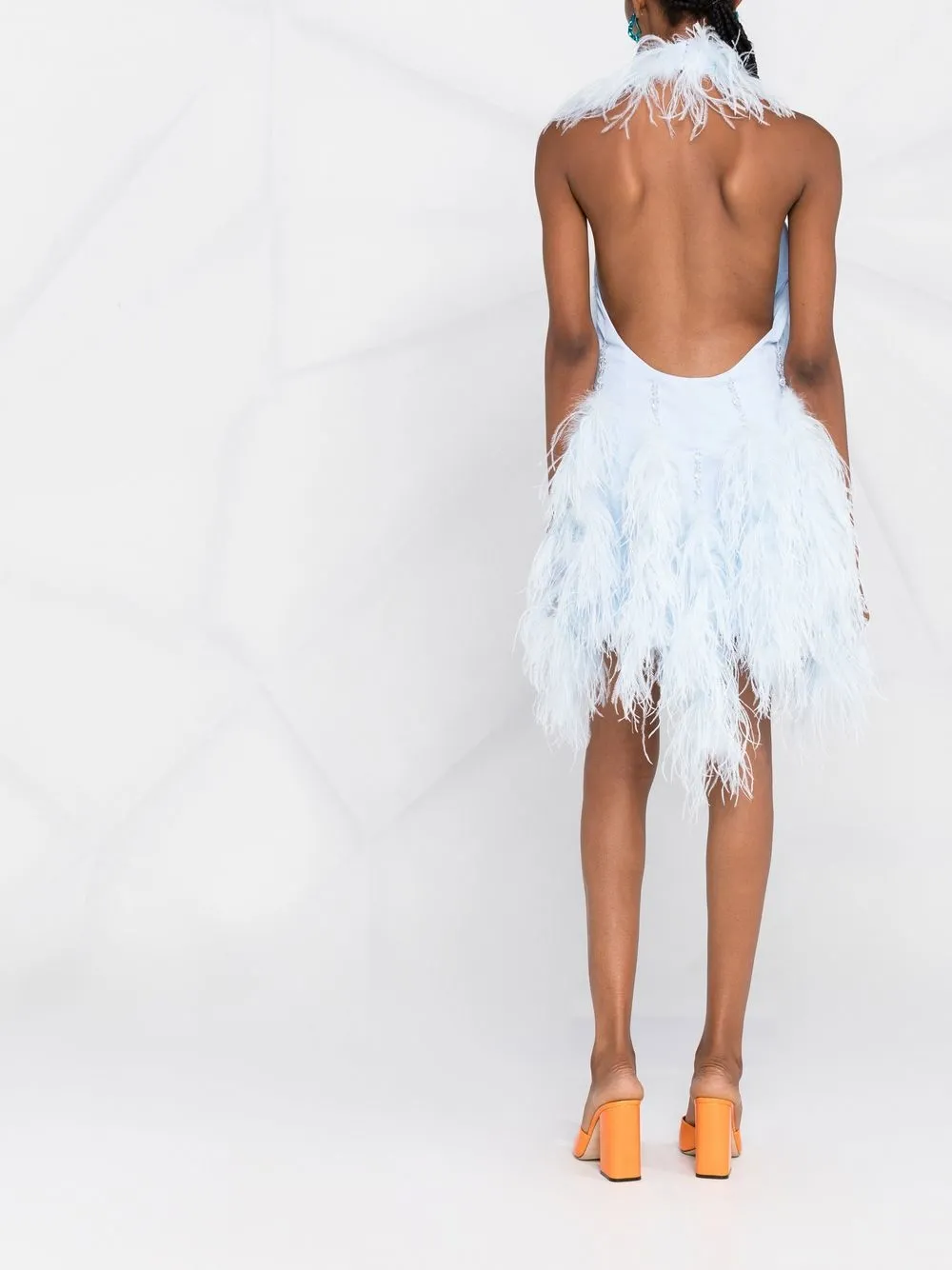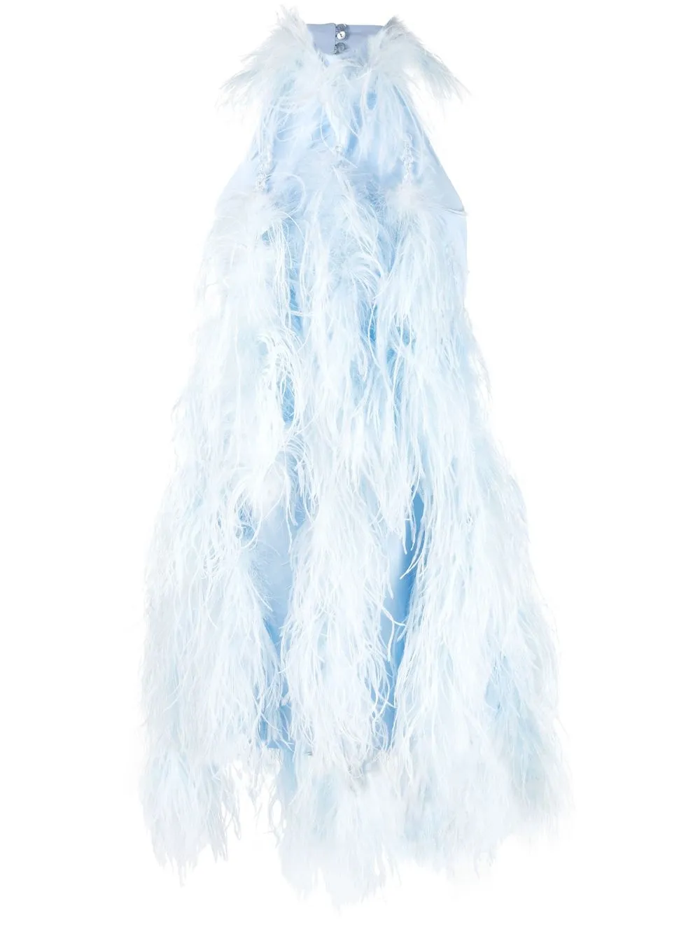 Голубой, перья, вырез-петля халтер, без рукавов, открытая спина и асимметричный подол