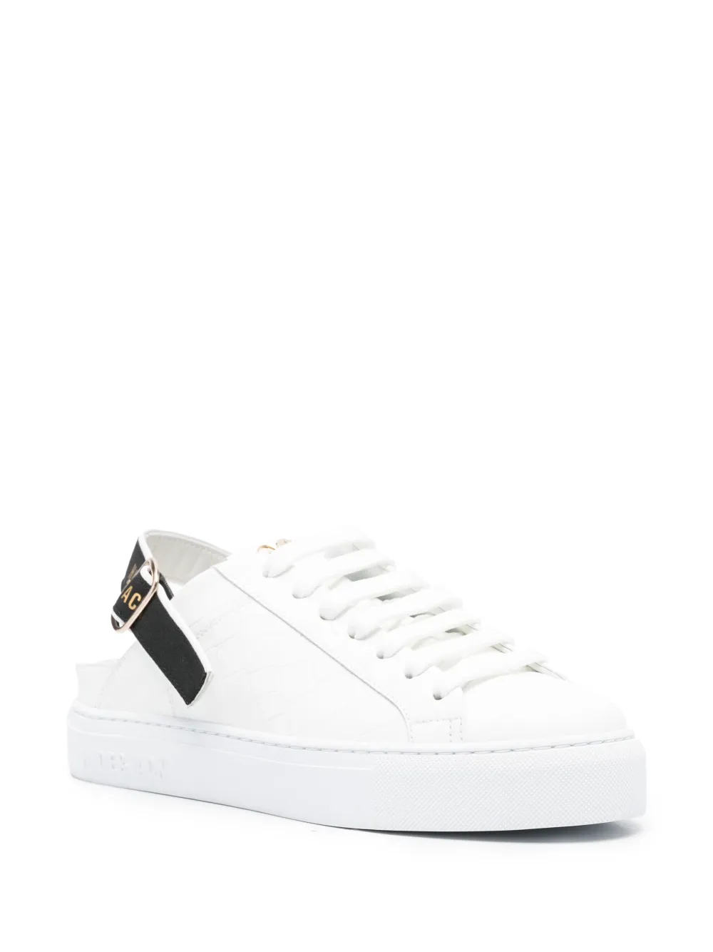 Белый, кожа, тиснение под кожу крокодила, стелька с логотипом, закругленный носок, ремешок на пятке и плоская резиновая подошва. .