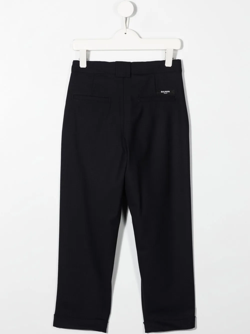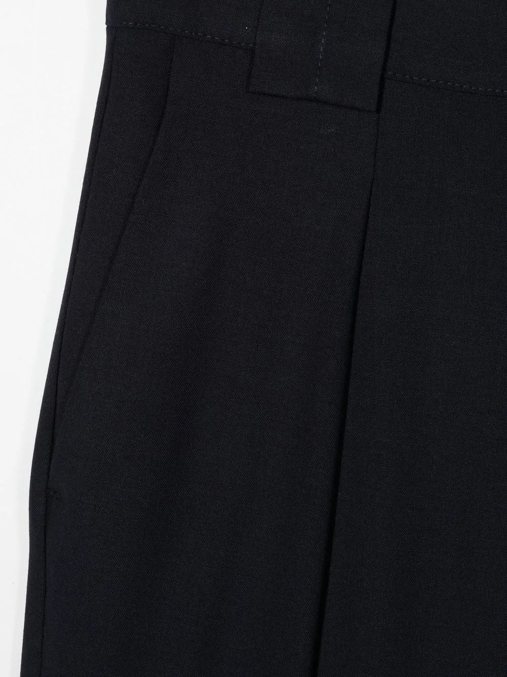 Темно-синий, смесовая необработанная шерсть, эластичный материал, средняя посадка, петли для ремня, потайная застежка спереди, прямой крой и два кармана с листочкой сзади