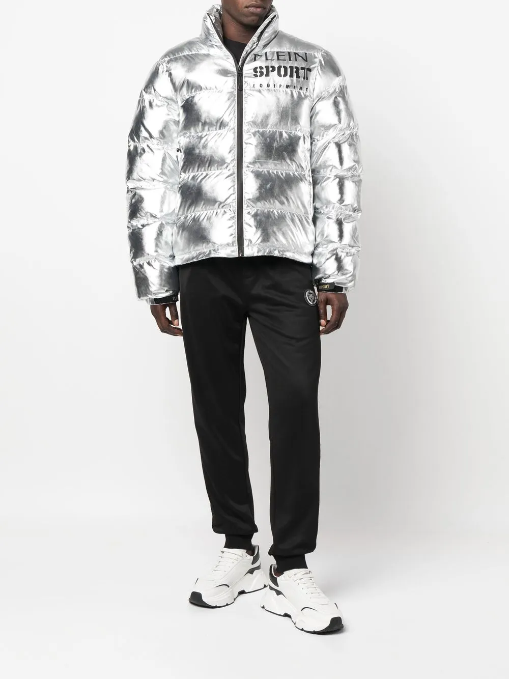 Серебро, покрытие с эффектом металлик, дутый материал, стеганая отделка, принт с логотипом на груди, высокий воротник, длинные рукава и застежка на молнии спереди