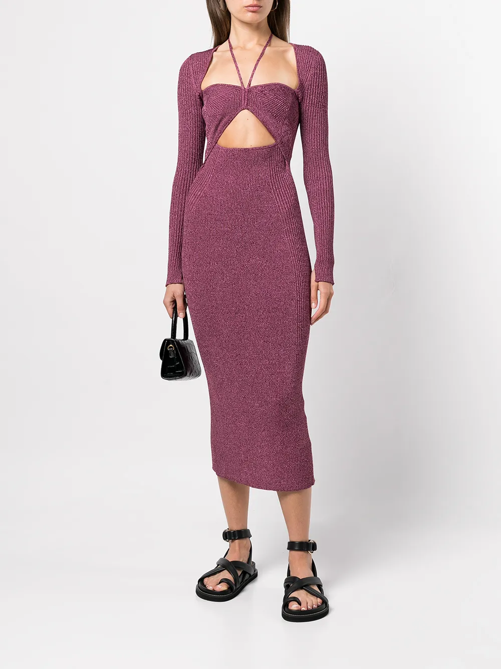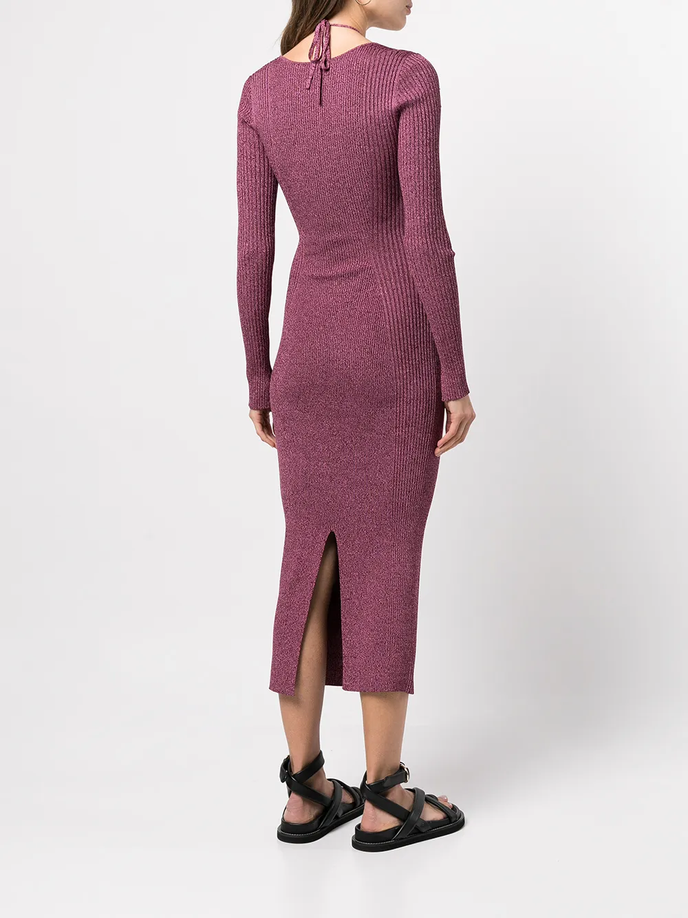 Фиолетовый, трикотажный материал, трикотаж в рубчик, вырезные детали, вырез в форме сердца, завязки вокруг шеи, длинные рукава, длина до середины икры и шлица по центру сзади