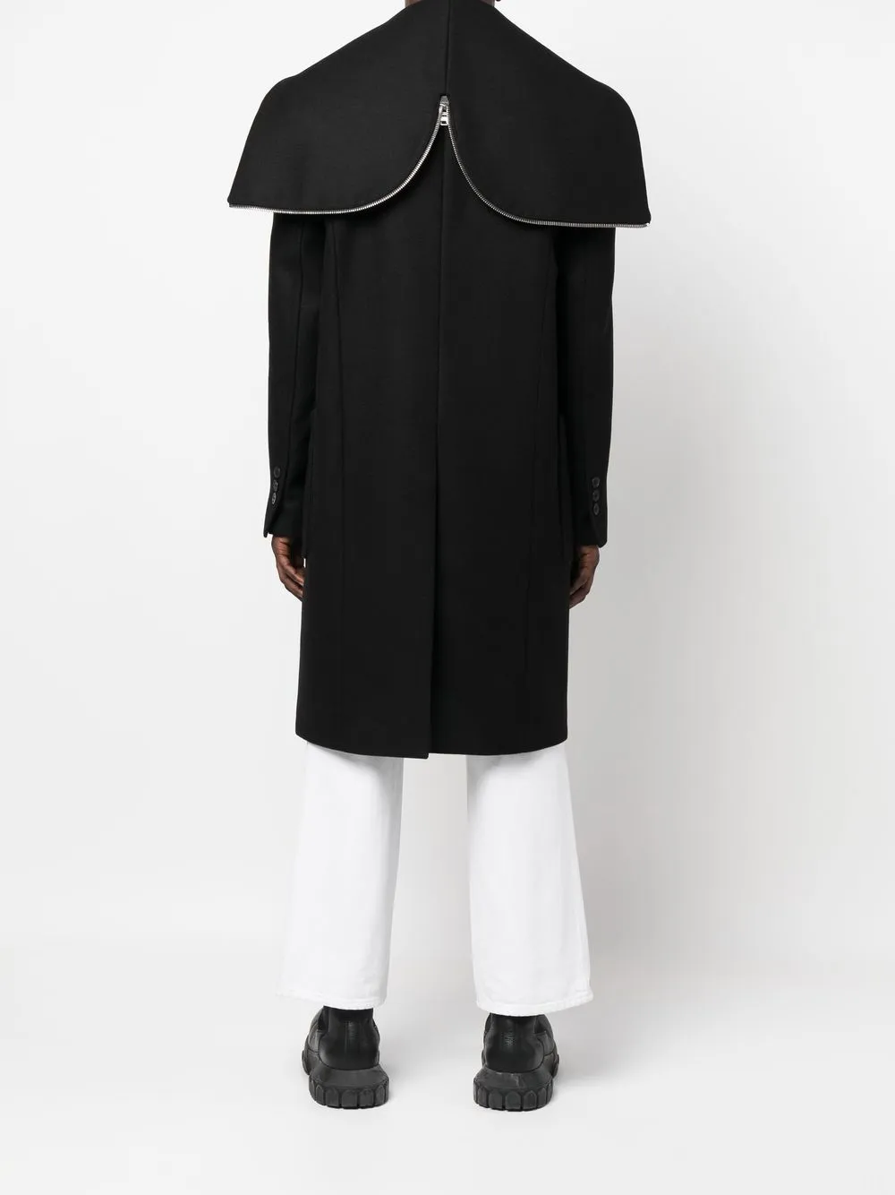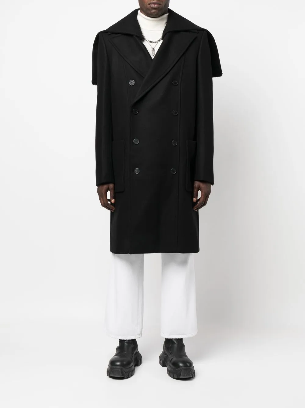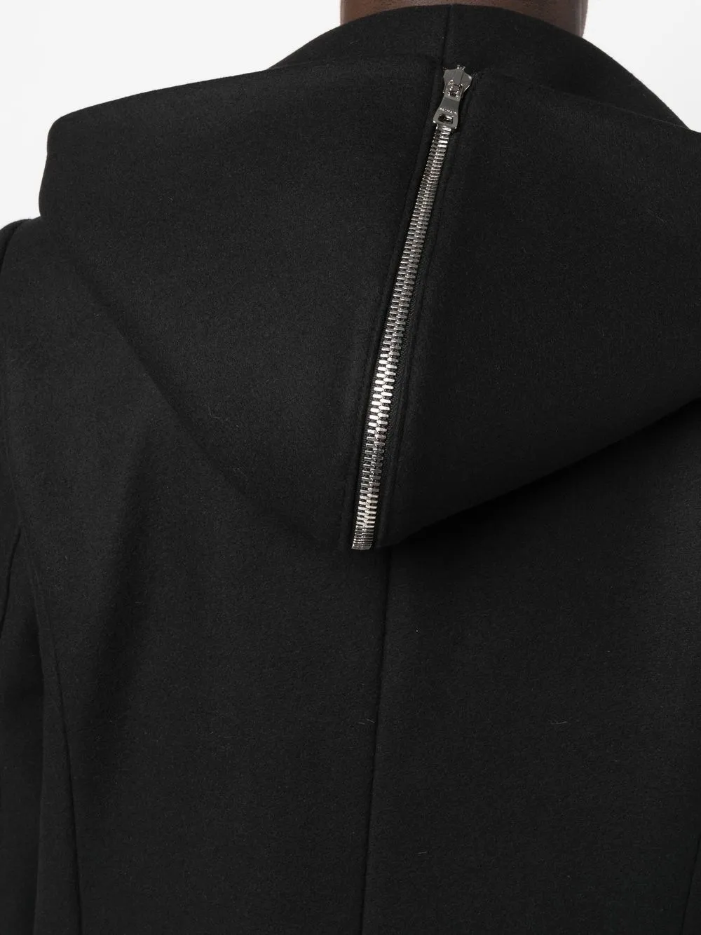 Черный, смесовая необработанная шерсть, деталь с молнией, съемный капюшон, широкие заостренные лацканы, двубортная застежка на кнопки, длинные рукава, два накладных кармана спереди и длина миди
