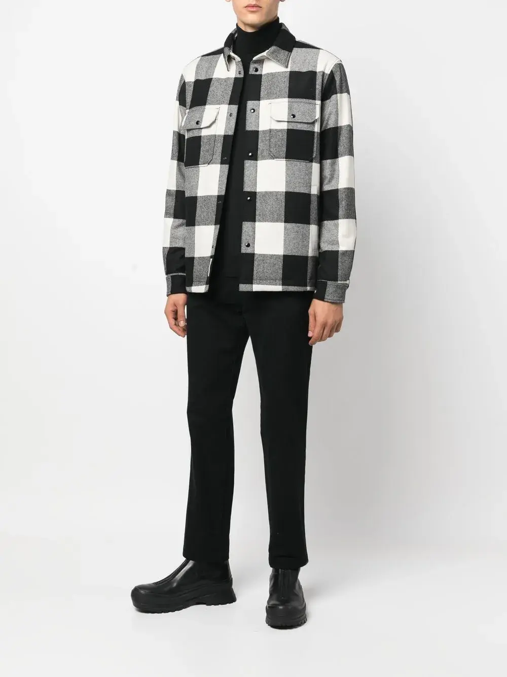 Черный/белый, смесовая шерсть, наполнитель из пуха и перьев, клетчатый узор, классический воротник, застежка на кнопках спереди, два передних кармана с клапанами, длинные рукава, манжеты на пуговицах и прямой подол