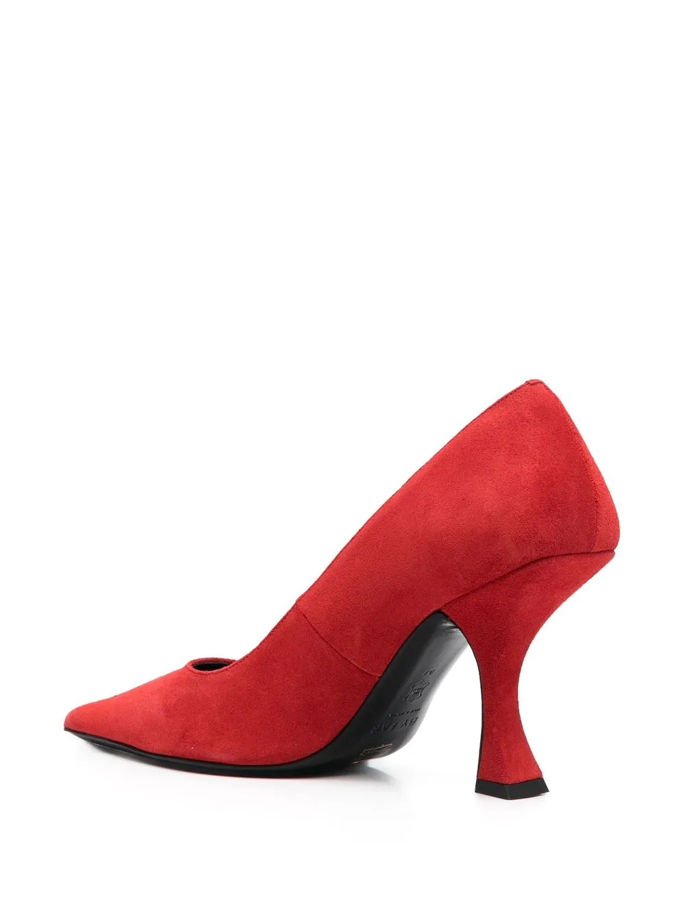 Ярко-красный, телячья кожа, заостренный носок, скульптурный каблук средней высоты, кожаная стелька с логотипом и модель без застежки
