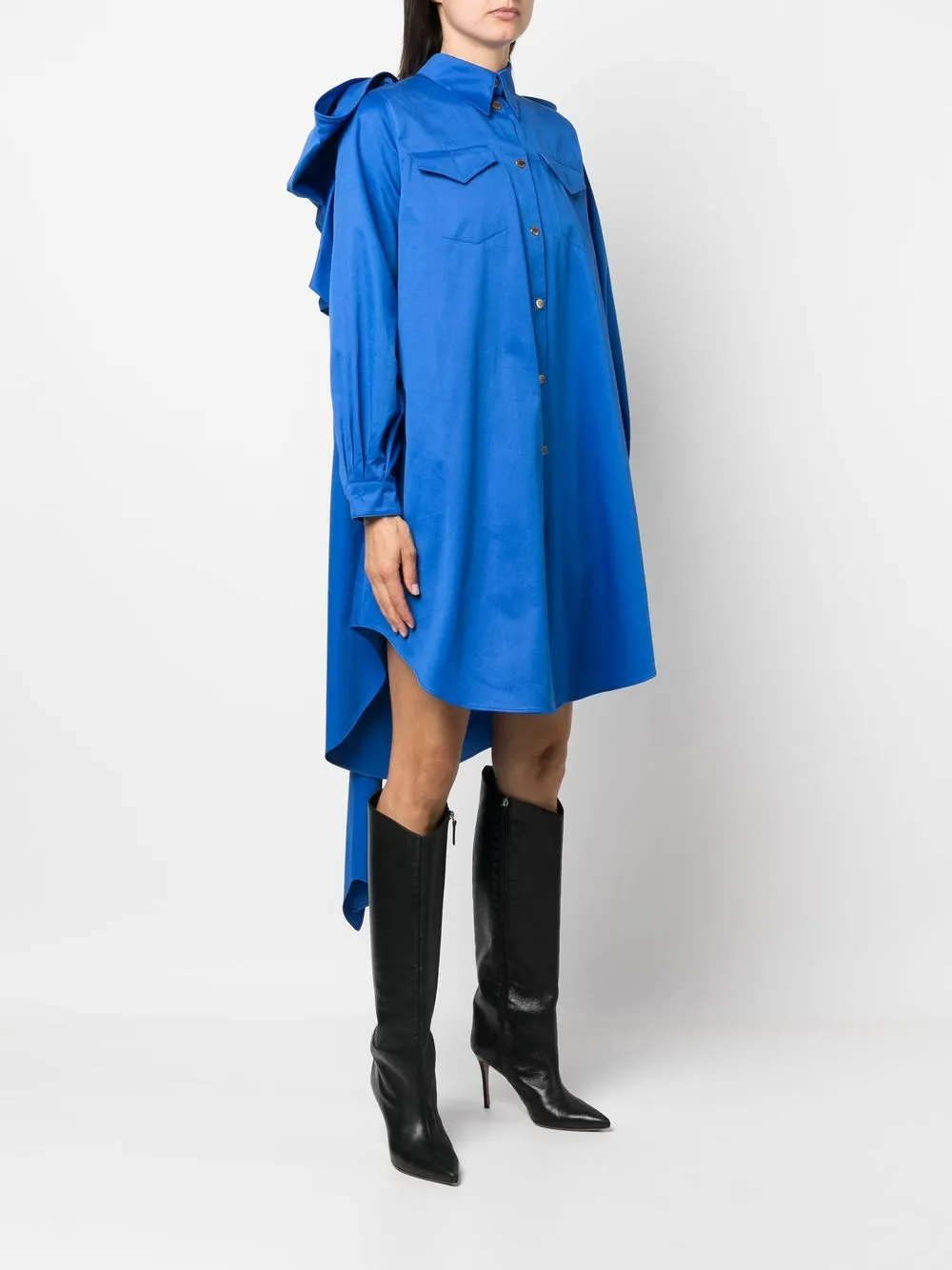 Синий, хлопок, съемный бант, классический воротник, длинные рукава, два нагрудных кармана с клапанами, съемный пояс и застежка на кнопках спереди