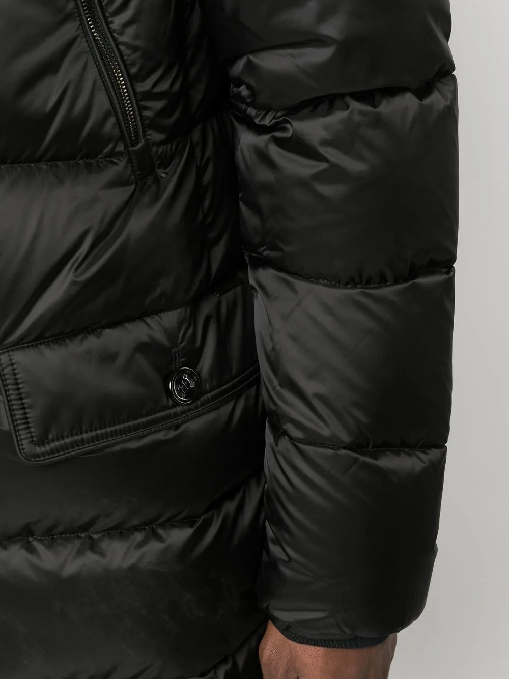 Черный, наполнитель из пуха и перьев, дутый материал, застежка на молнии и пуговице спереди, два передних кармана с клапанами, два передних кармана с листочкой, съемный капюшон, длинные рукава, внутренний карман и прямой подол
