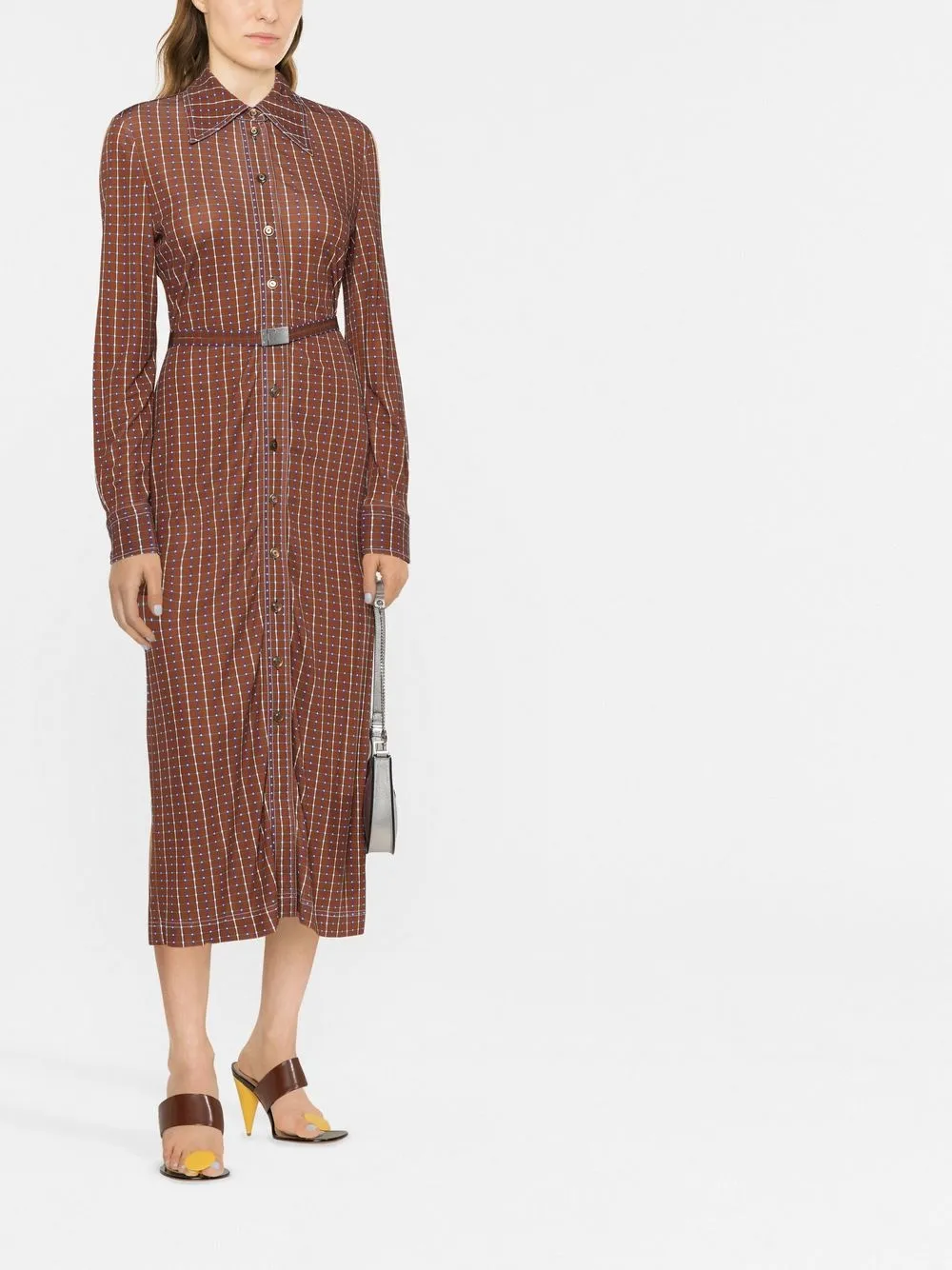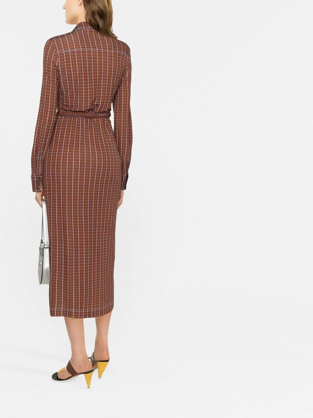 Красно-коричневый, геометричный принт, широкий заостренный воротник, застежка на пуговицах спереди, длинные рукава, ремень на талии и длина миди.