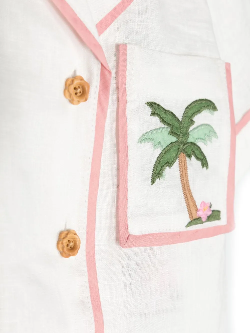 Цвет слоновой кости, лен, хлопок, аппликация, кубинский воротник, накладной карман спереди, контрастная отделка, застежка на пуговицах спереди, короткие рукава и прямой подол