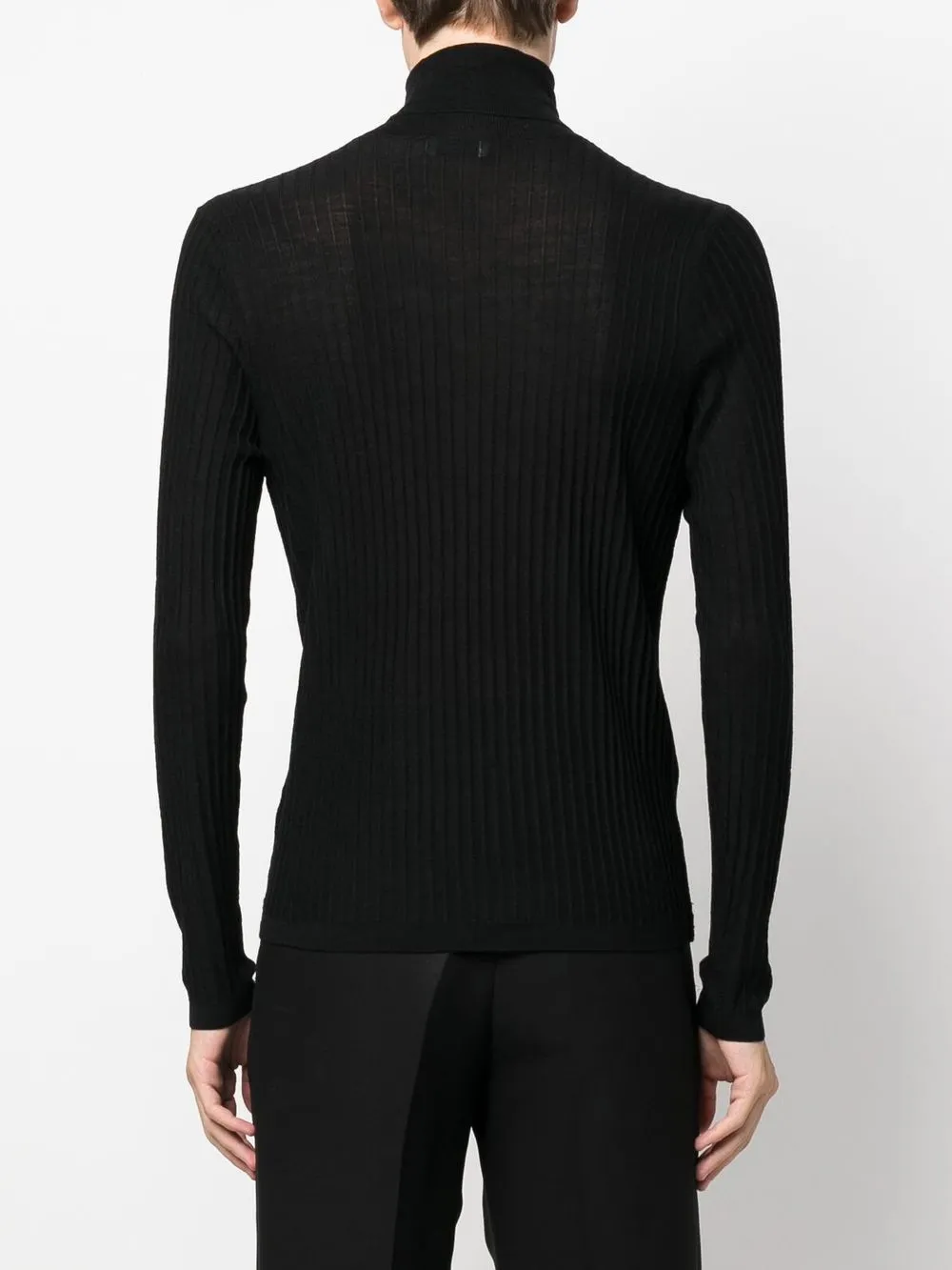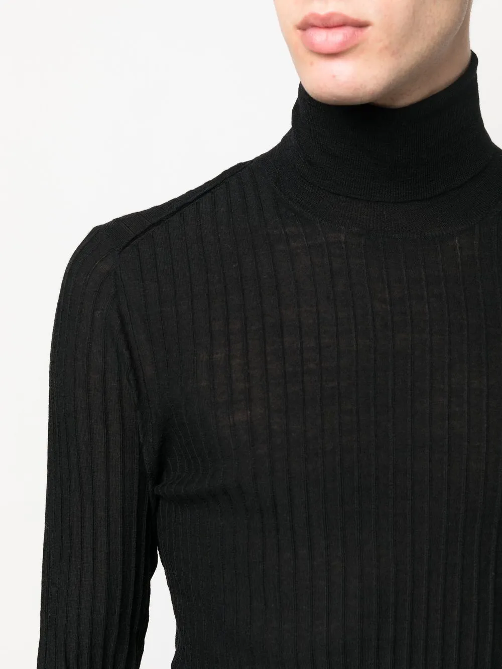 Трикотаж в рубчик, высокий воротник, длинные рукава и прямой подол