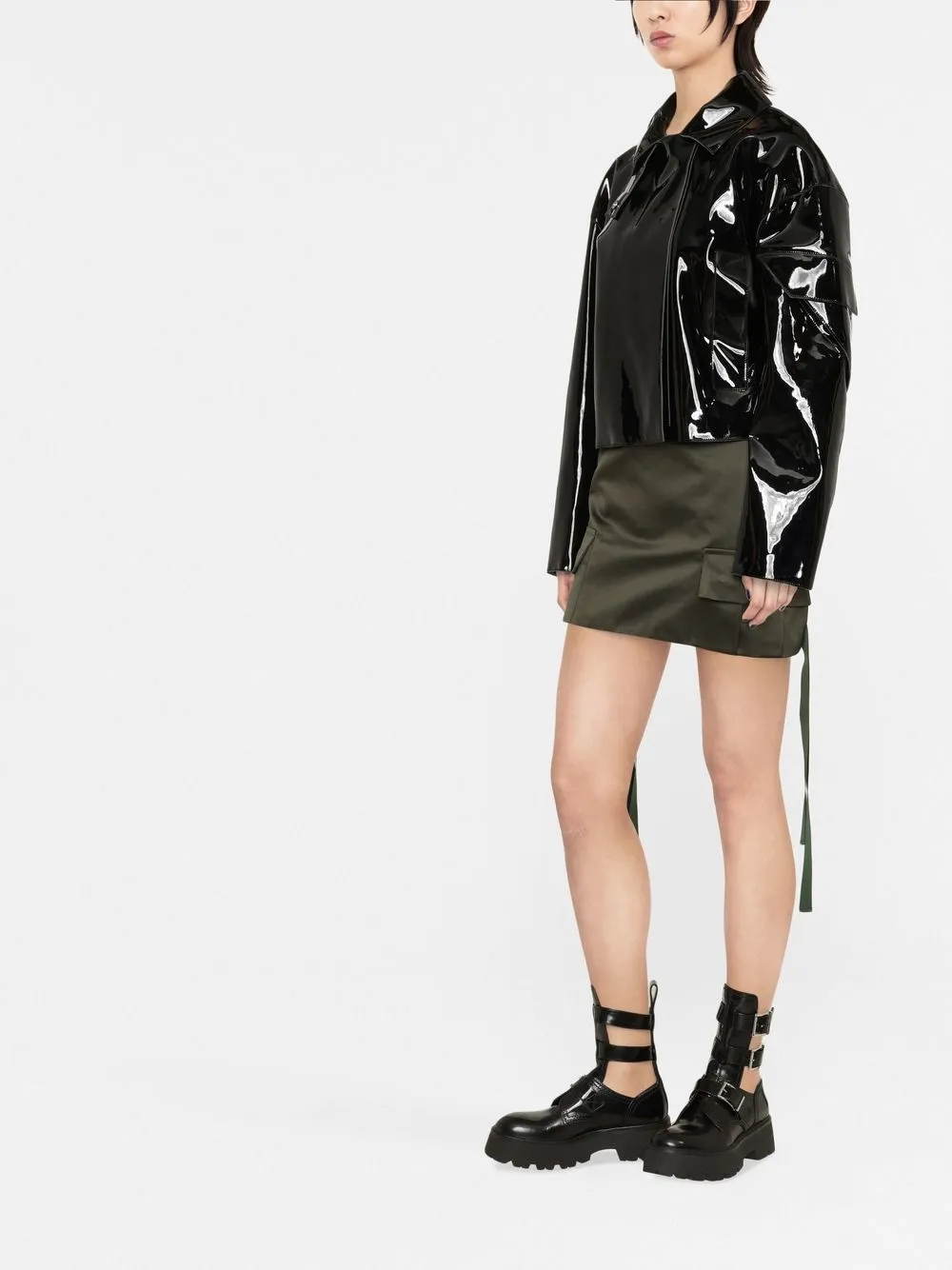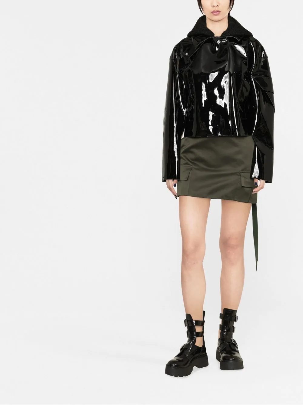 Черный, глянцевый финиш, съемный капюшон, серебристая фурнитура, цельная подкладка, потайная застежка спереди, прорезные карманы по бокам, приспущенные плечи, карман с клапаном на рукаве, длинные рукава, закругленный подол и укороченная длина