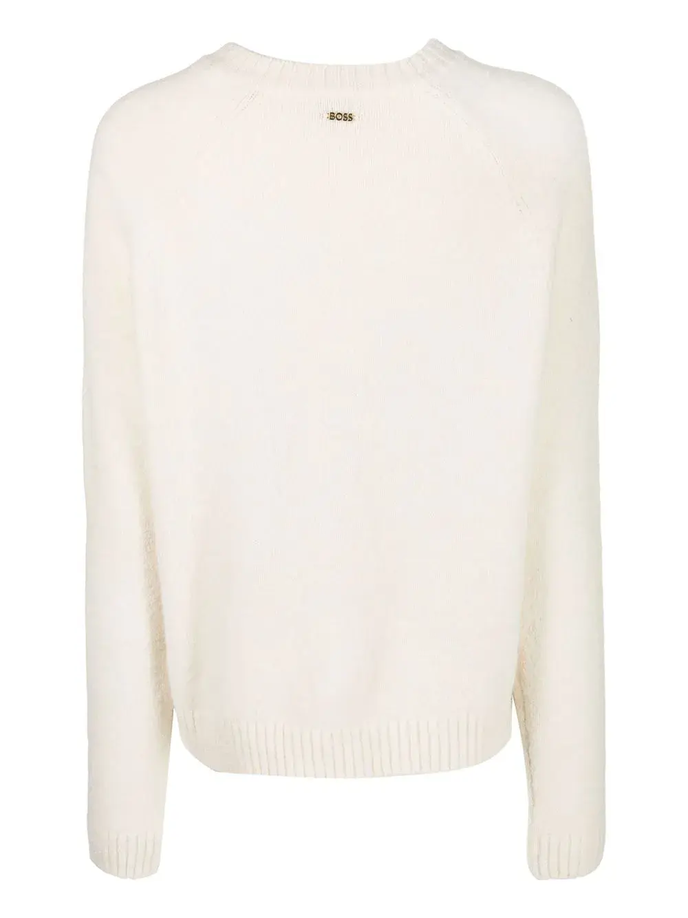 Кремово-белый, трикотажный материал, круглый вырез, длинные рукава, манжеты в рубчик, воротник-стойка в рубчик и золотистый металлический логотип