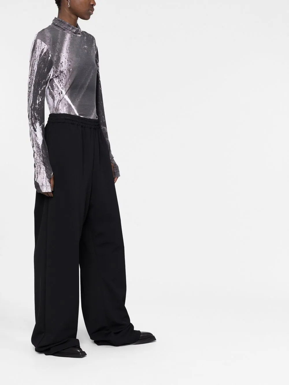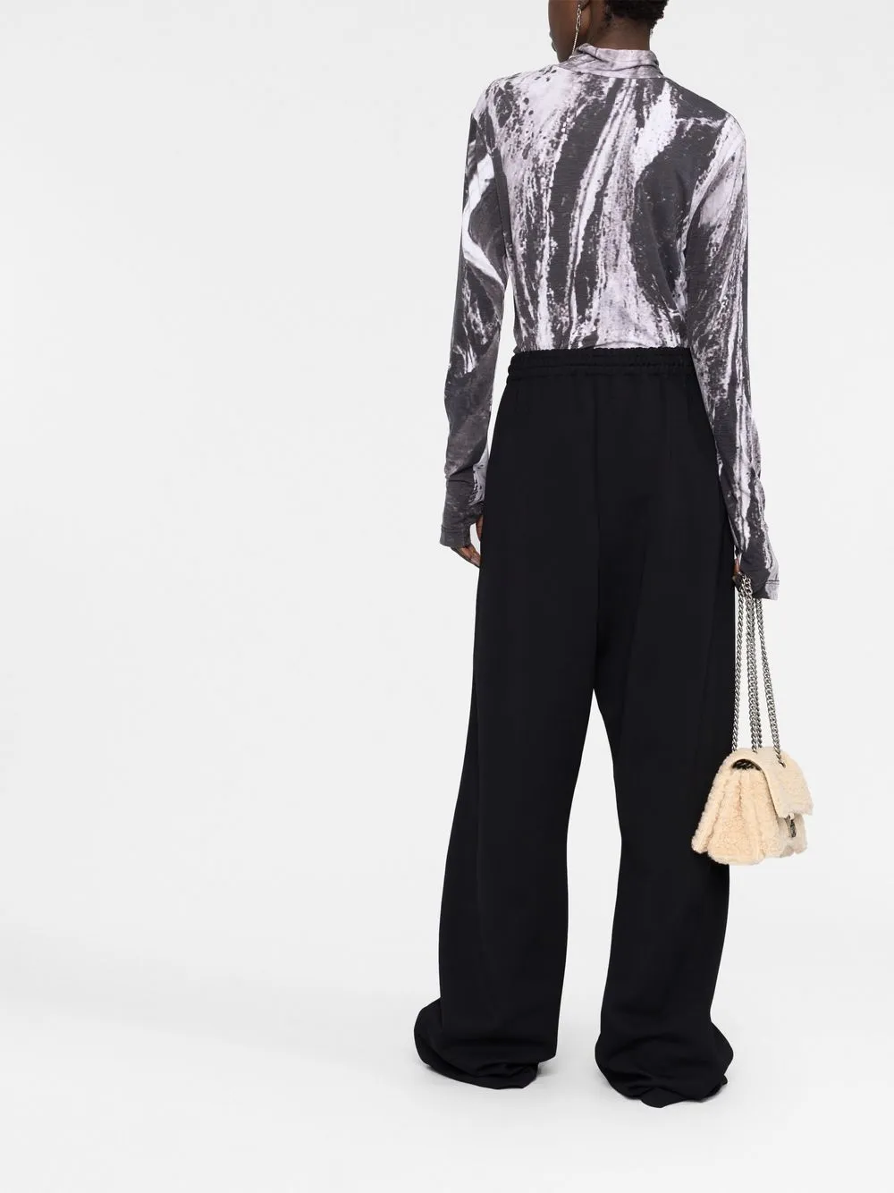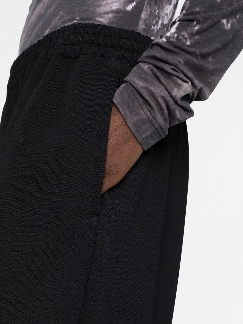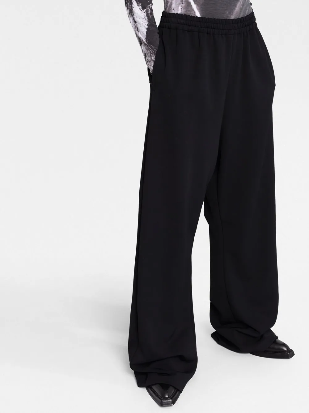 Черный, широкий крой, эластичный пояс и два прорезных кармана по бокам.