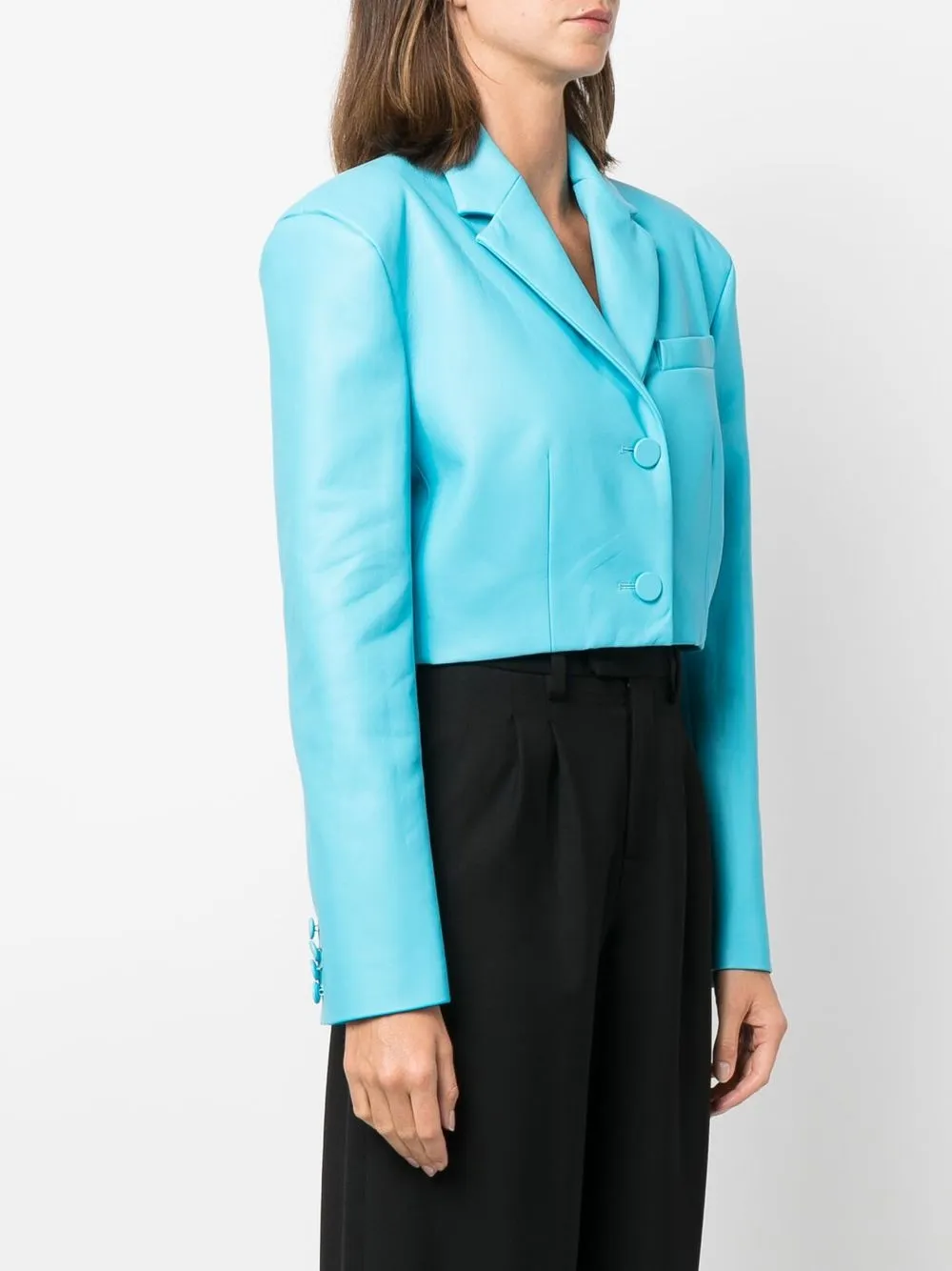 Сине-зеленый, овечья кожа, зазубренные лацканы, застежка на пуговицах спереди, длинные рукава, манжеты на пуговицах, прямой подол, укороченная длина и прорезной карман на груди