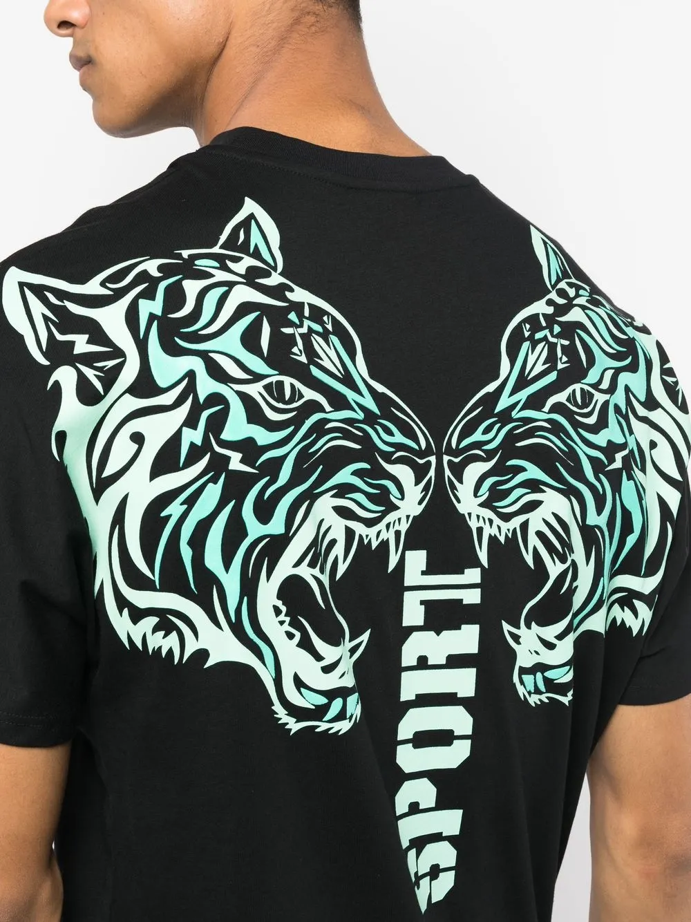Смесовый хлопок, принт с изображением тигра, круглый вырез, короткие рукава и прямой подол