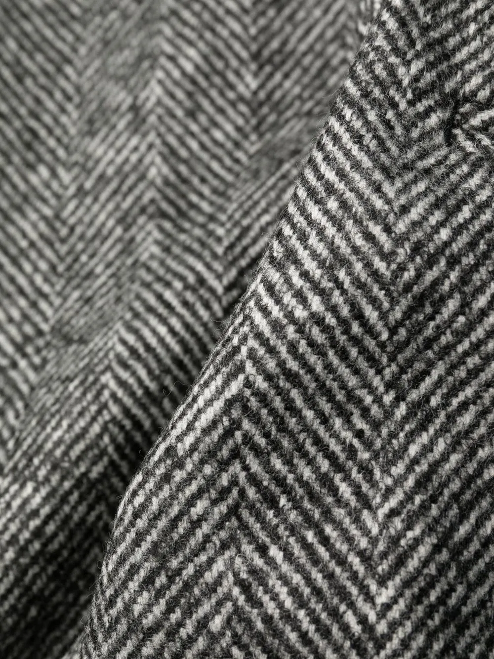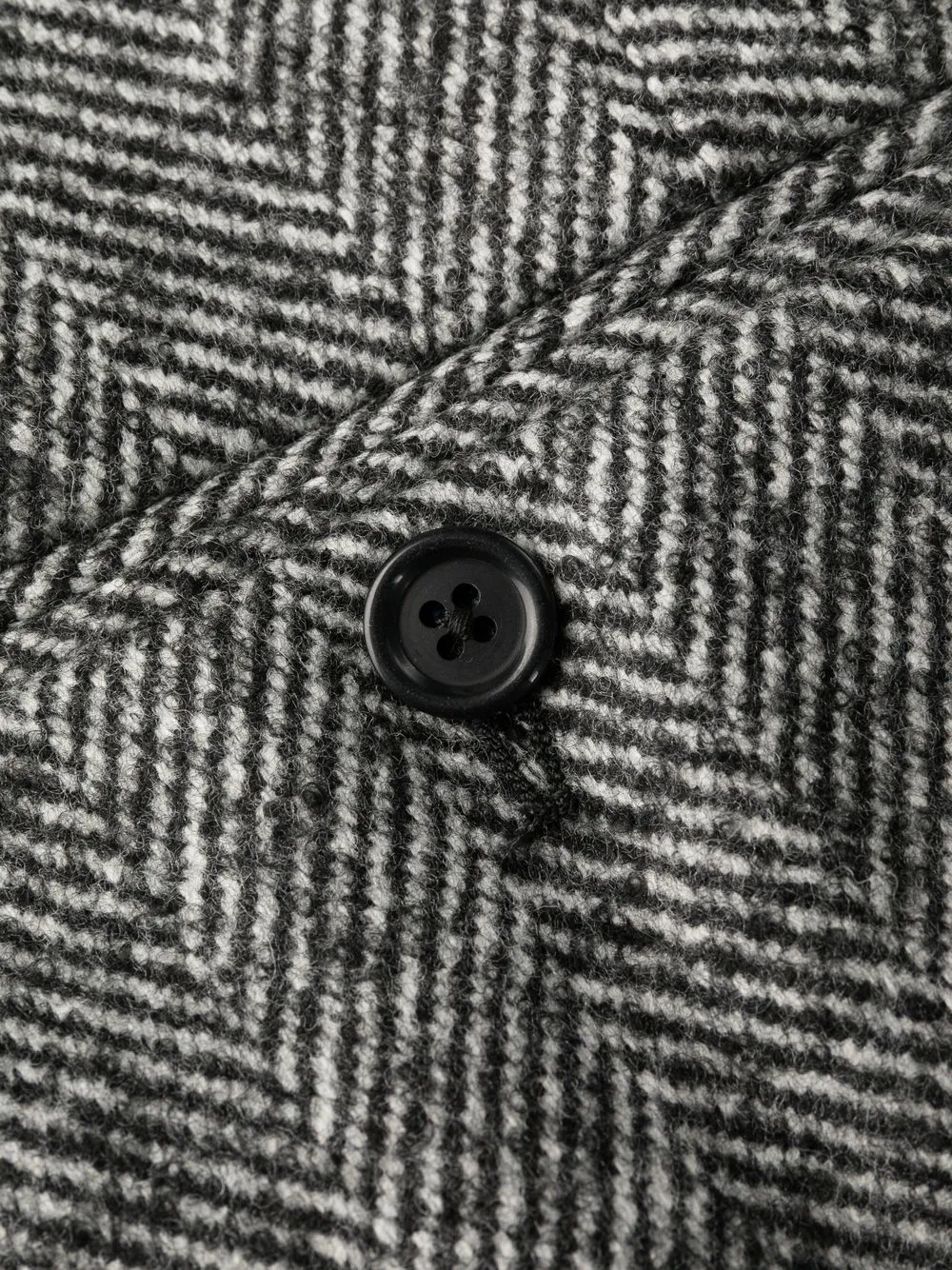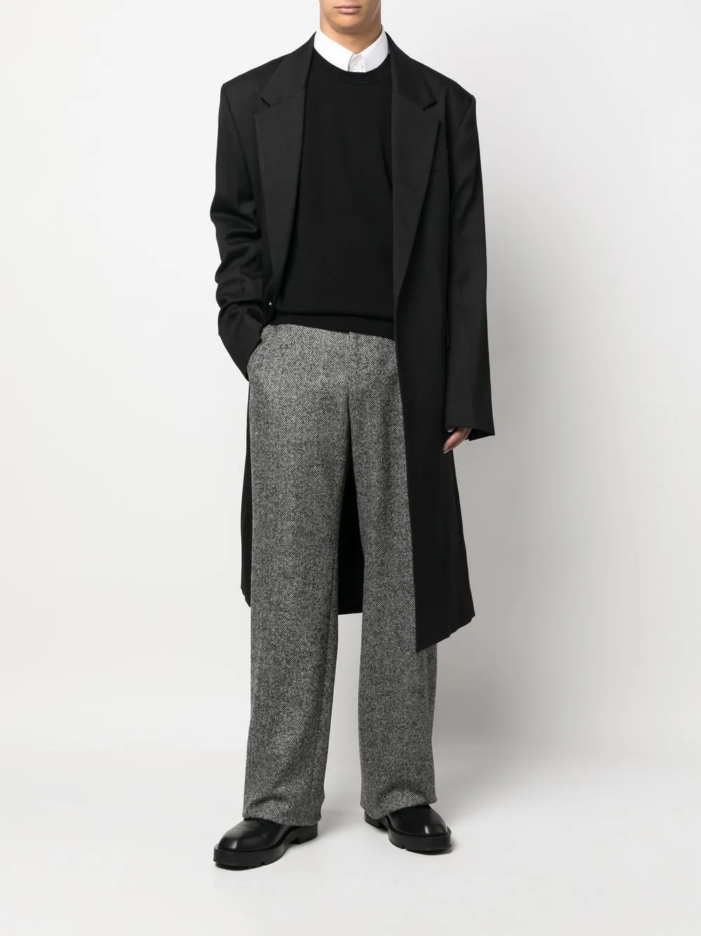 Серый, смесовая необработанная шерсть, прямой крой, застежка на пуговицы, петли для ремня, два прорезных кармана по бокам и два кармана с листочкой сзади