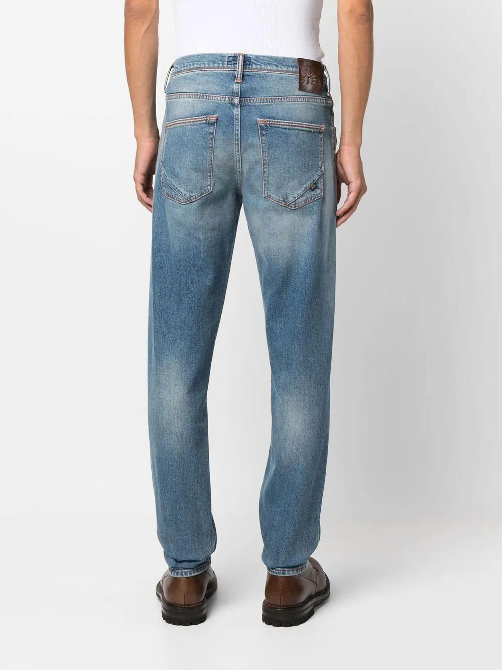 Голубой, эластичный хлопок, эффект потертости, облегающий крой, кожаный ремешок, средняя посадка, петли для ремня, застежка на пуговицах спереди и пять карманов