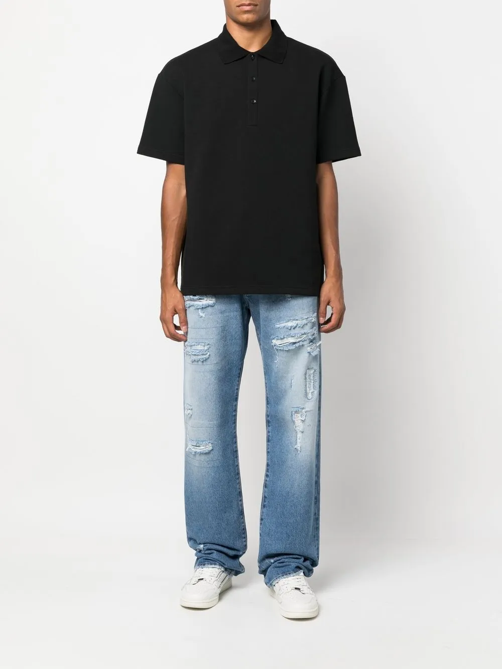 Голубой, хлопок, искусственно состаренное покрытие, нашивка с логотипом сзади, петли для ремня, застежка на молнии и пуговице спереди, прямой крой, пять карманов и необработанные края