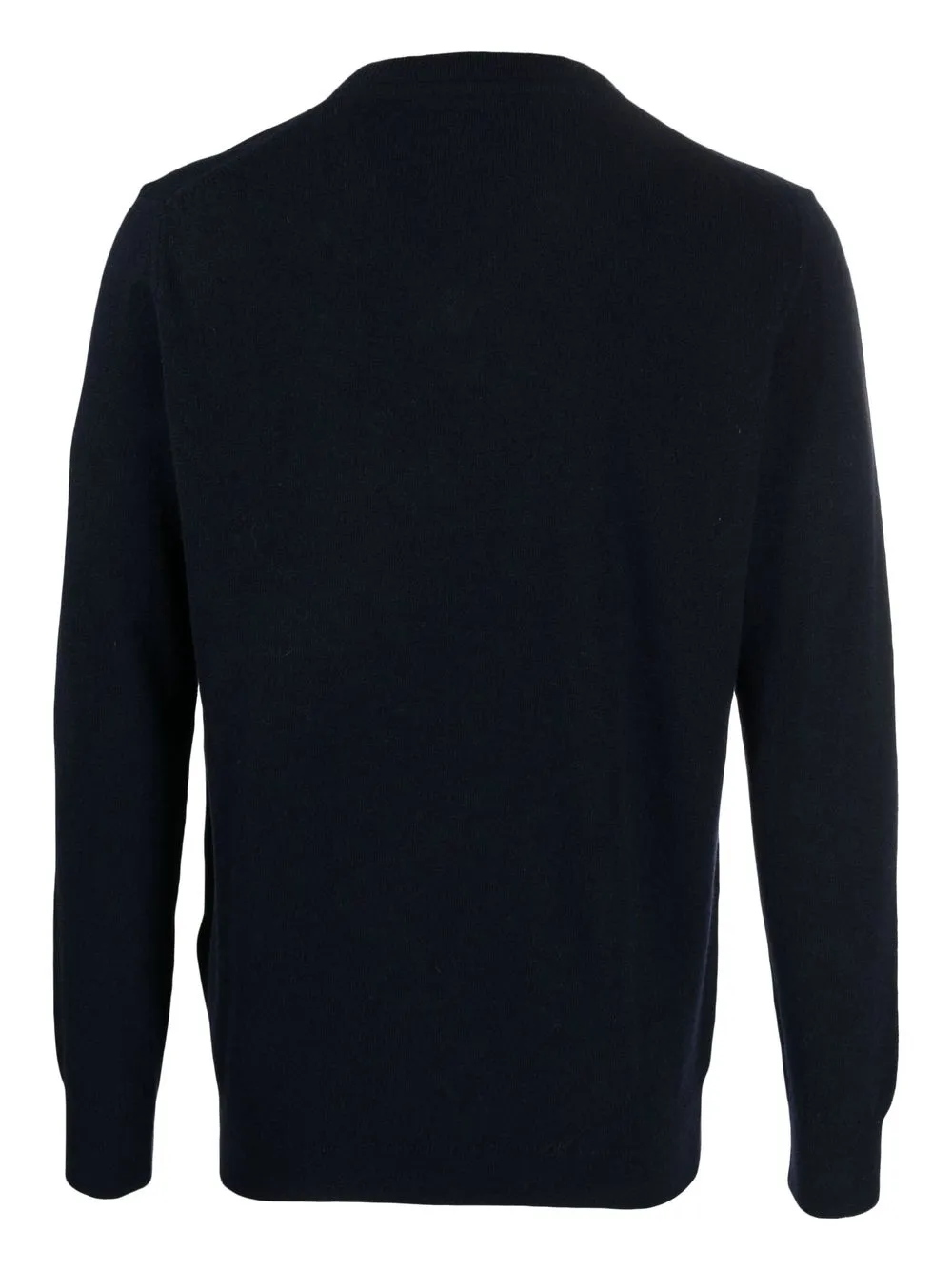 Темно-синий, шерсть, тонкая вязка, отделка в рубчик, вышитый логотип на груди, V-образный вырез, длинные рукава и прямой подол