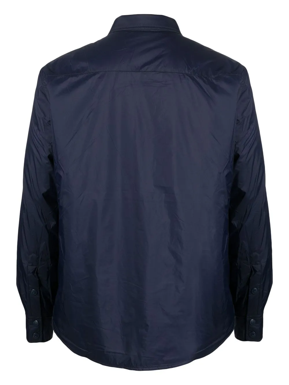 Темно-синий, дутый материал, классический воротник, нагрудный накладной карман, длинные рукава и застежка на пуговицах спереди