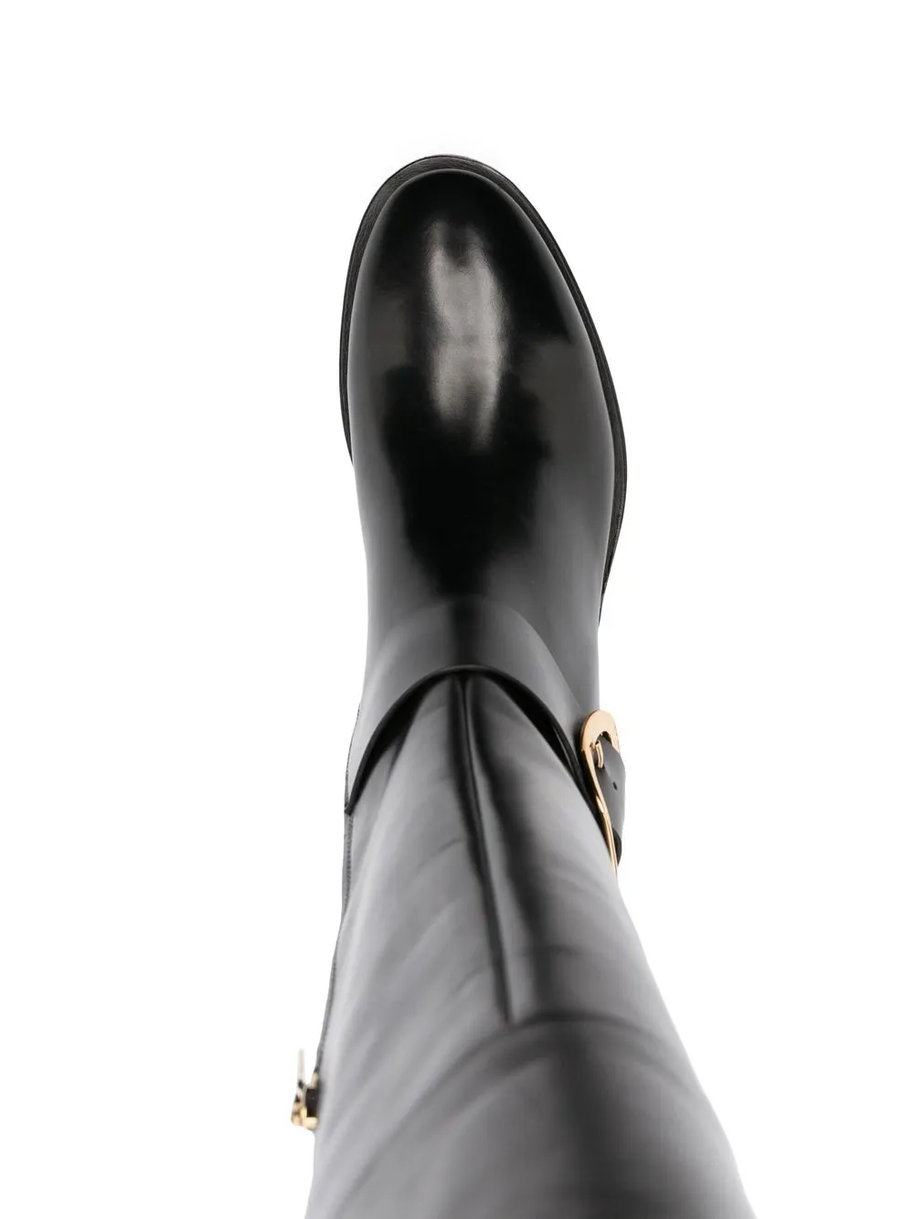 Золотистая фурнитура, декоративная пряжка, застежка на молнии сбоку, длина по колено, закругленный носок и плоская резиновая подошва