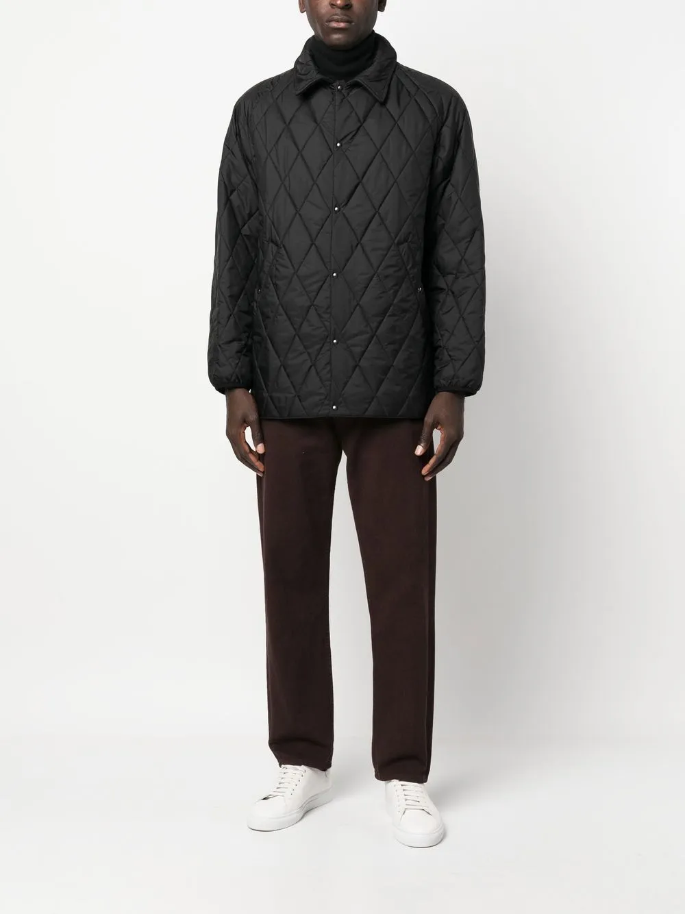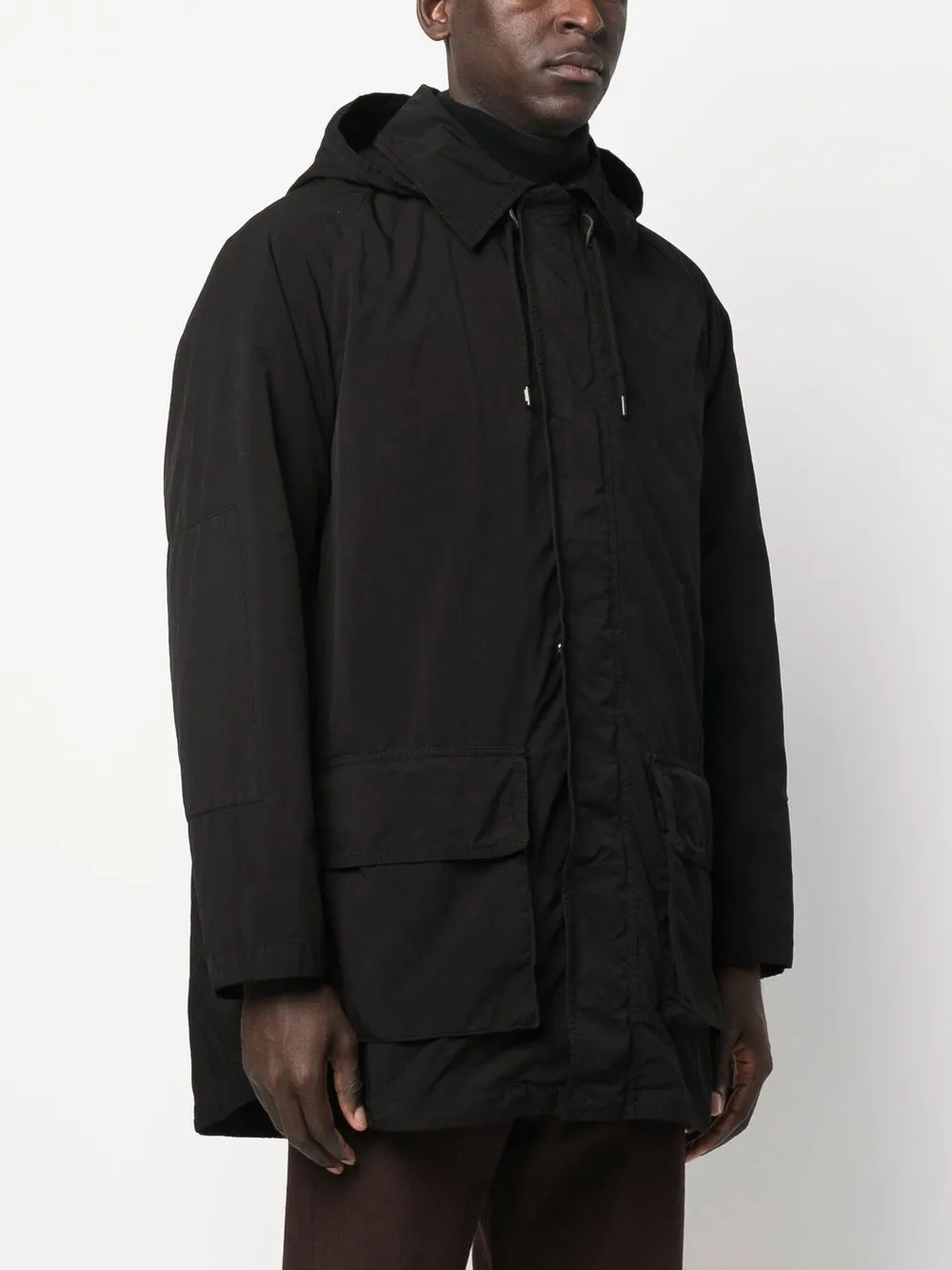 Стеганый материал, многослойный дизайн, два кармана с клапанами по бокам, застежка на кнопки и молнию спереди, затягивающийся на шнурок капюшон, классический воротник, длинные рукава и прямой подол