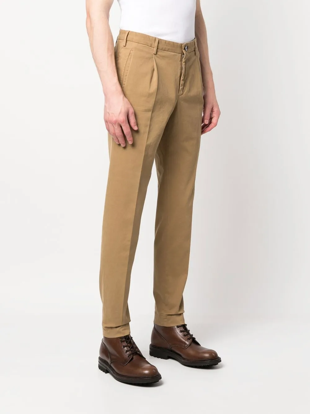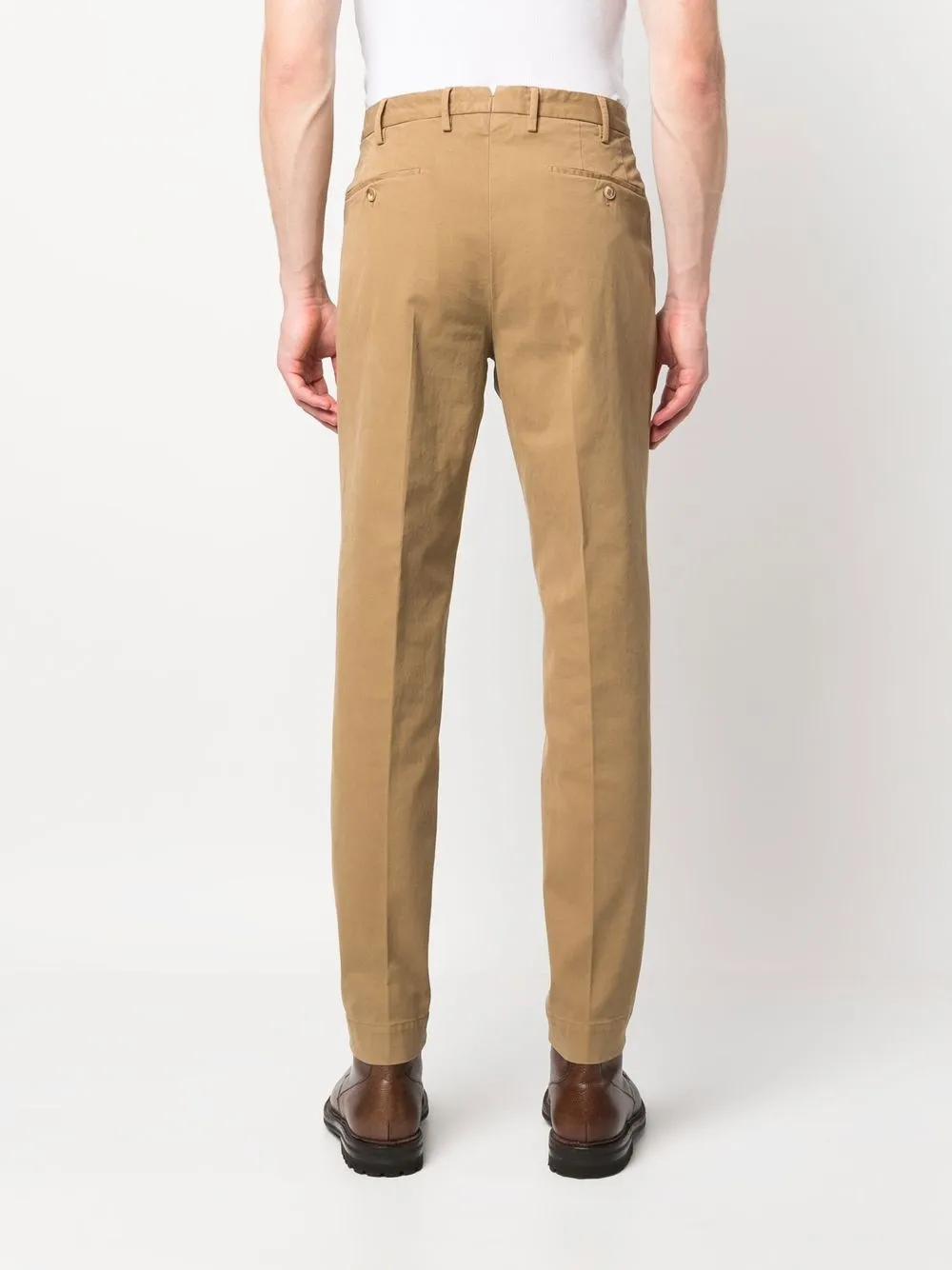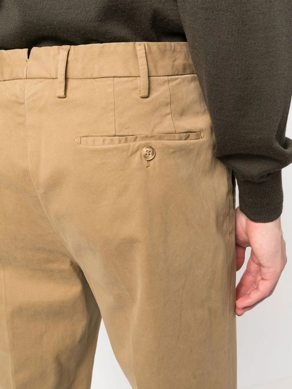 Эластичный хлопок, защипы, складки, петли для ремня, застежка на молнии и пуговице спереди, два вшитых кармана по бокам, два прорезных кармана на пуговицах сзади и прямой крой