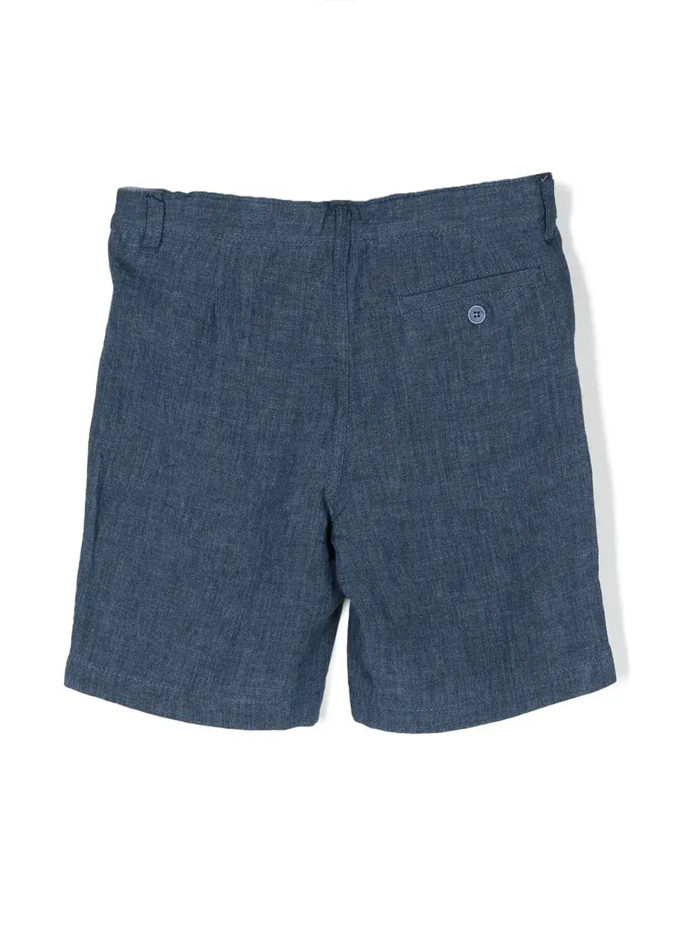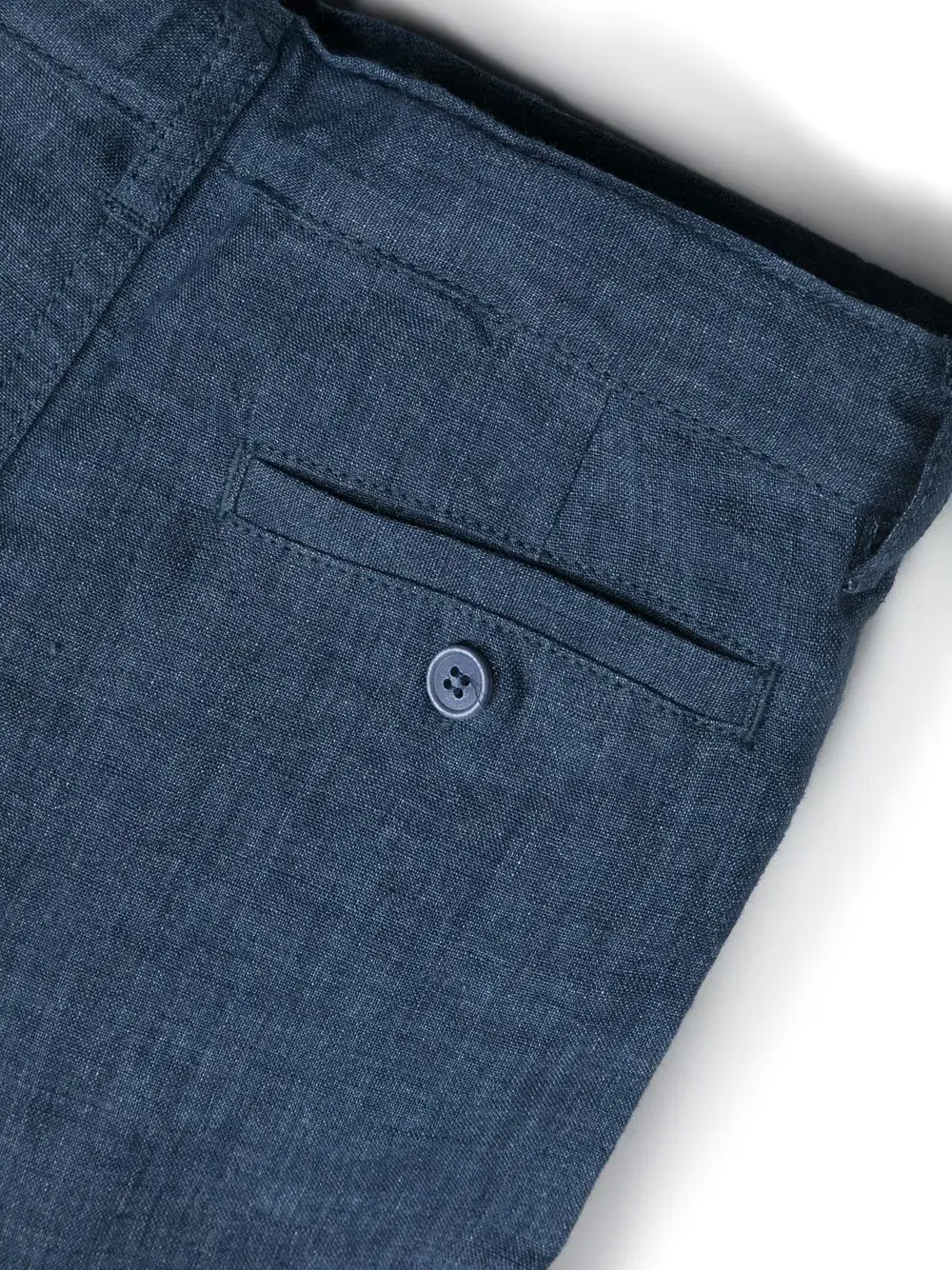 Подробнее о товаре: Темно-синий, лен, эффект меланж, потайная застежка на молнии и пуговицах, петли для ремня, два кармана по бокам, задние карманы с листочкой и длина до бедер.