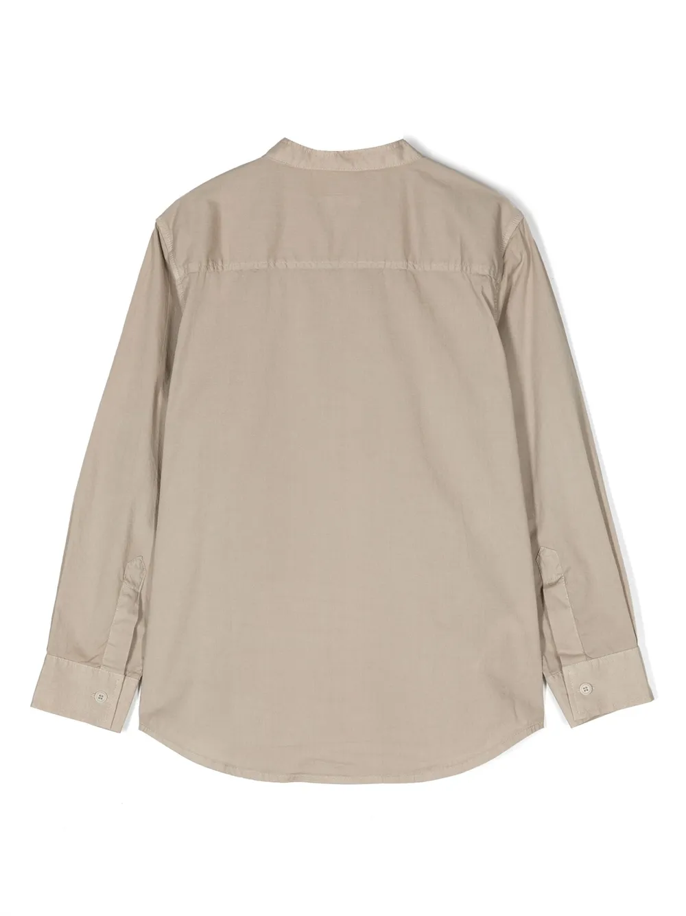 Бежевый, эластичный хлопок, воротник-стойка, застежка на пуговицах спереди, длинные рукава, манжеты на пуговицах и закругленный подол