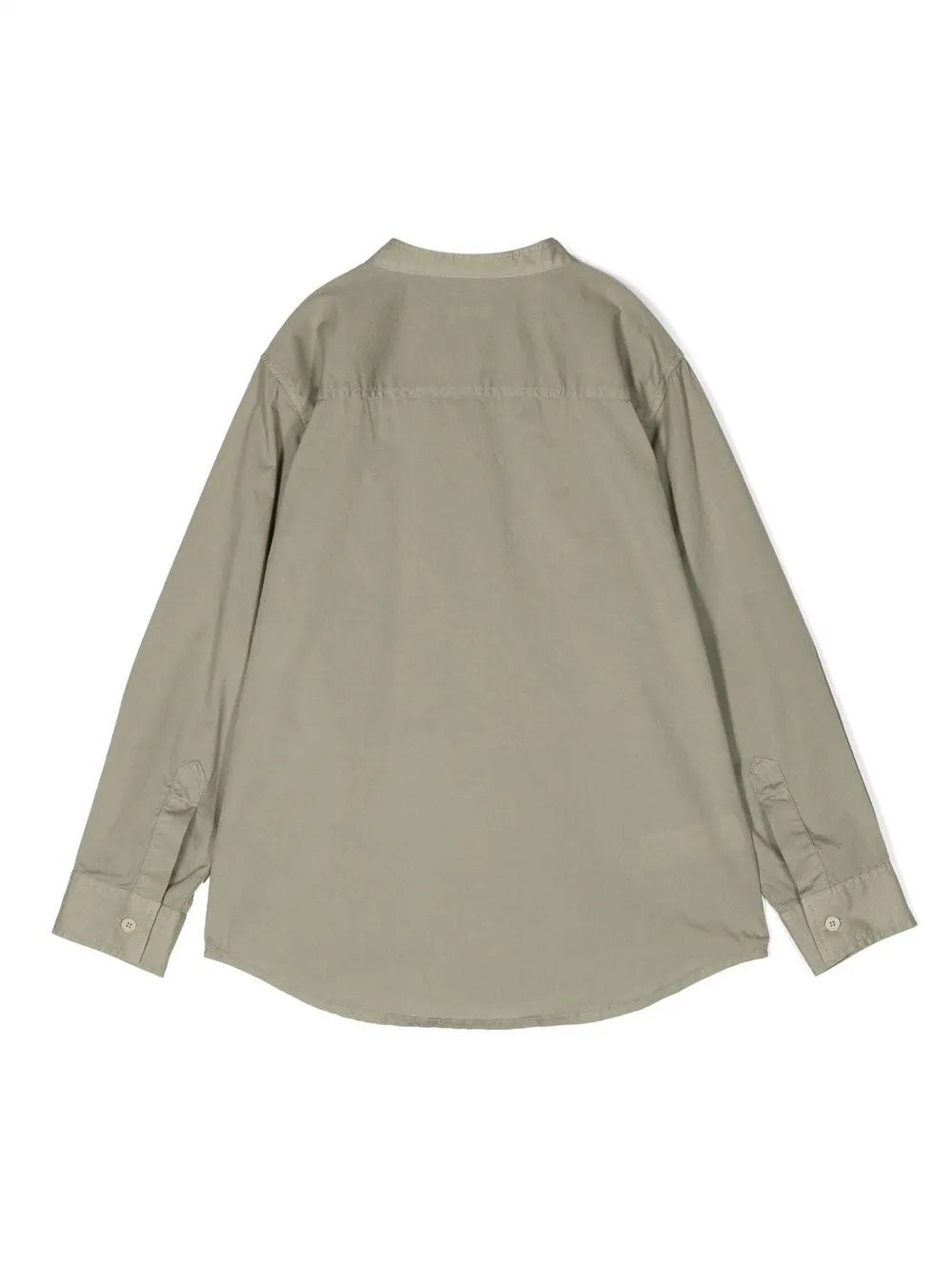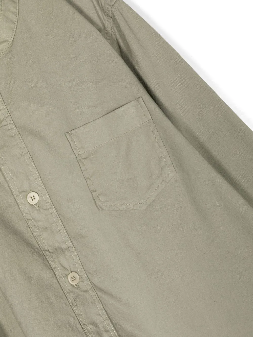 Серо-зеленый, эластичный хлопок, воротник-стойка, застежка на пуговицах спереди, длинные рукава, манжеты на пуговицах, нагрудный накладной карман и закругленный подол