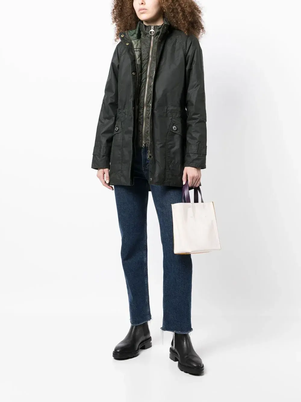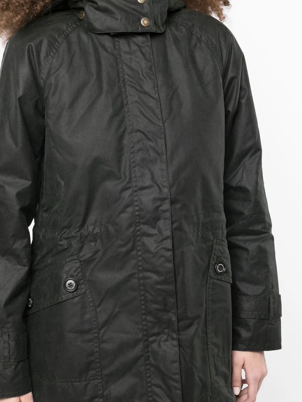 Темно-зеленый, хлопок, высокий воротник, потайная застежка спереди, длинные рукава, классический капюшон и два кармана на пуговице по бокам