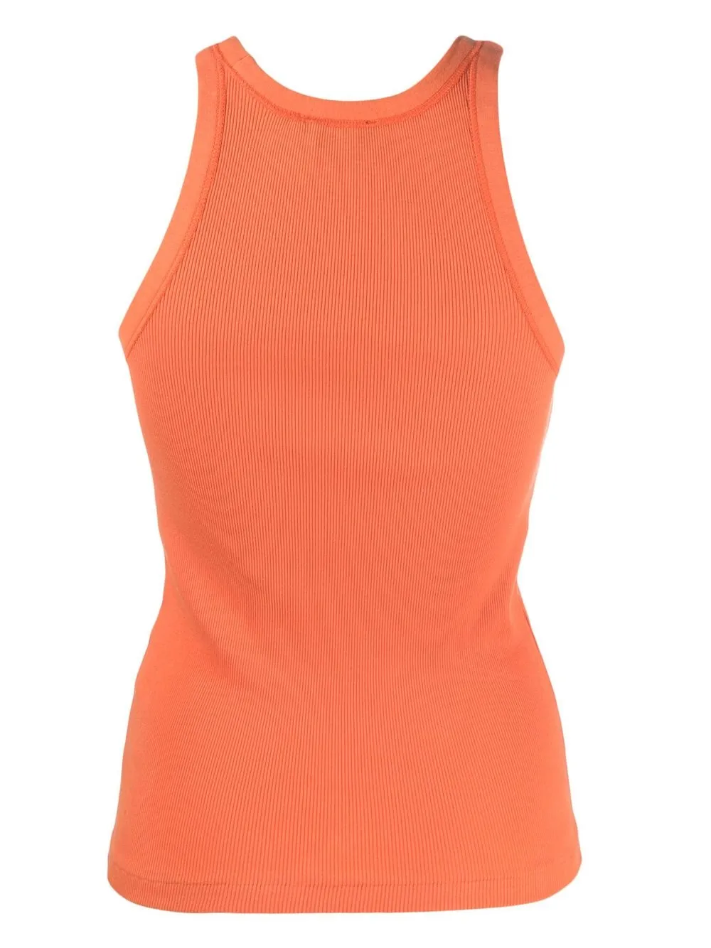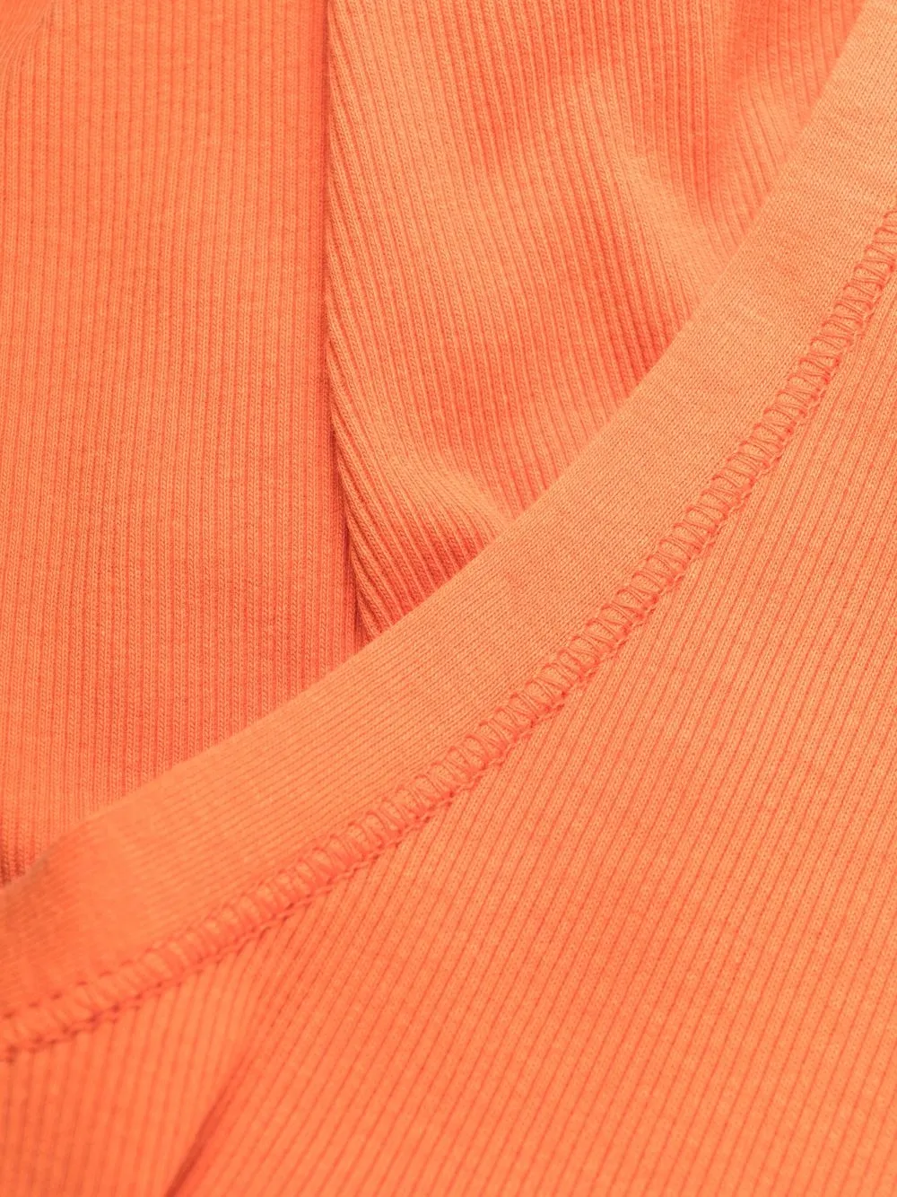 Тыквенно-оранжевый, хлопок, трикотаж в рубчик, ткань в мелкий рубчик, строчка в тон, круглый вырез, без рукавов и прямой подол