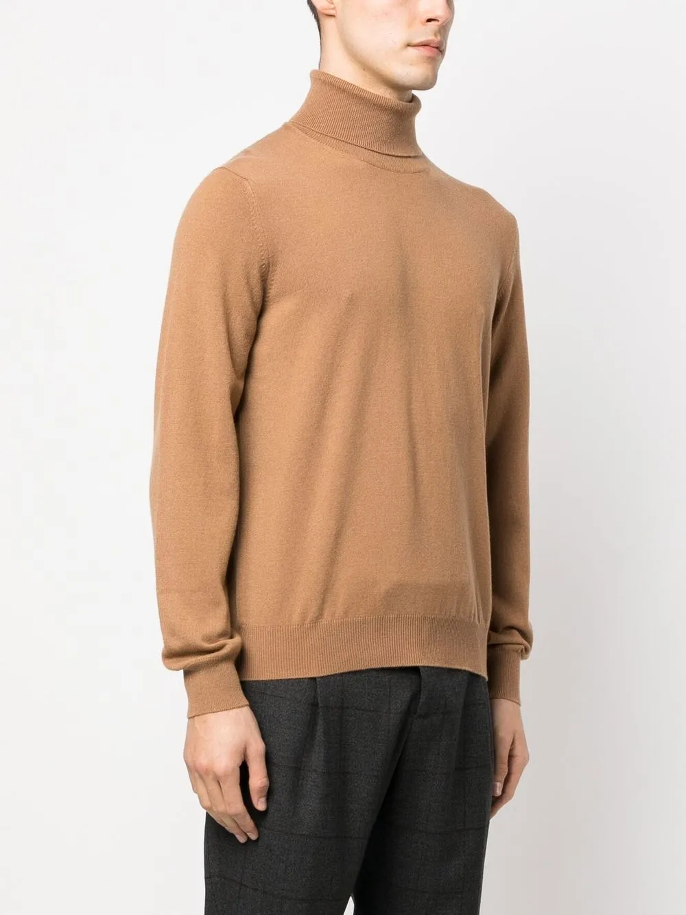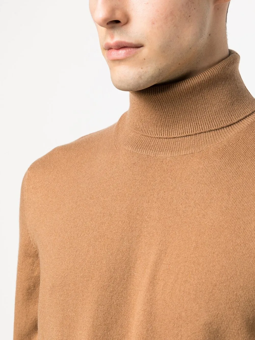 Коричневый, кашемир, трикотажный материал, высокий воротник, длинные рукава и прямой подол