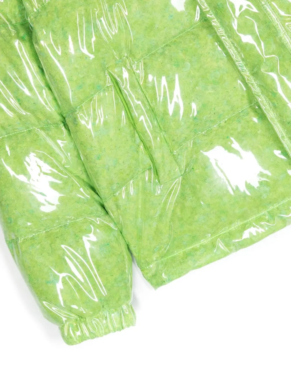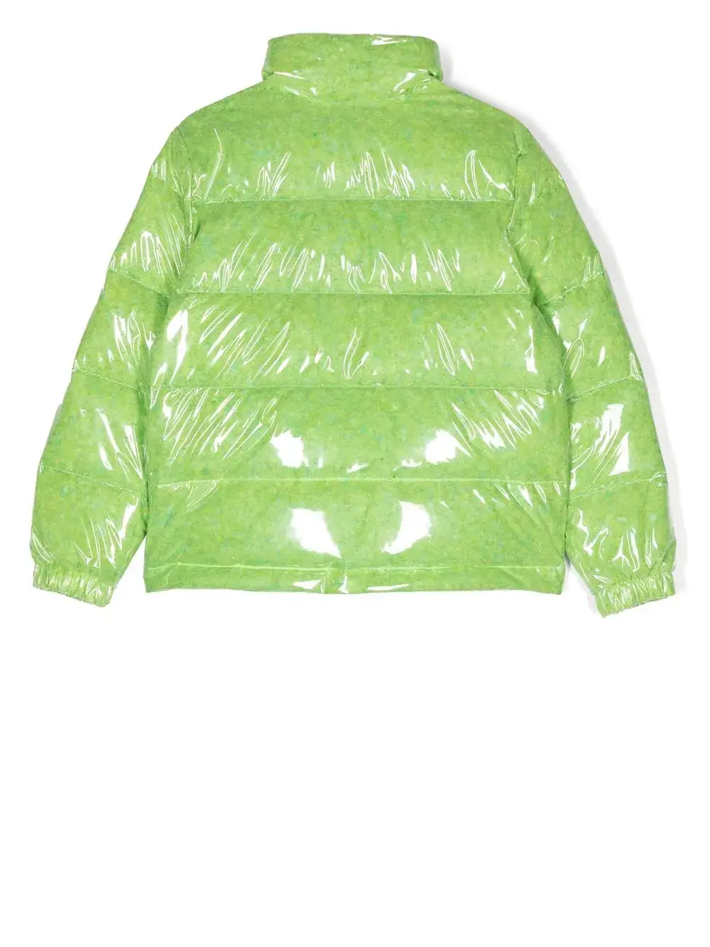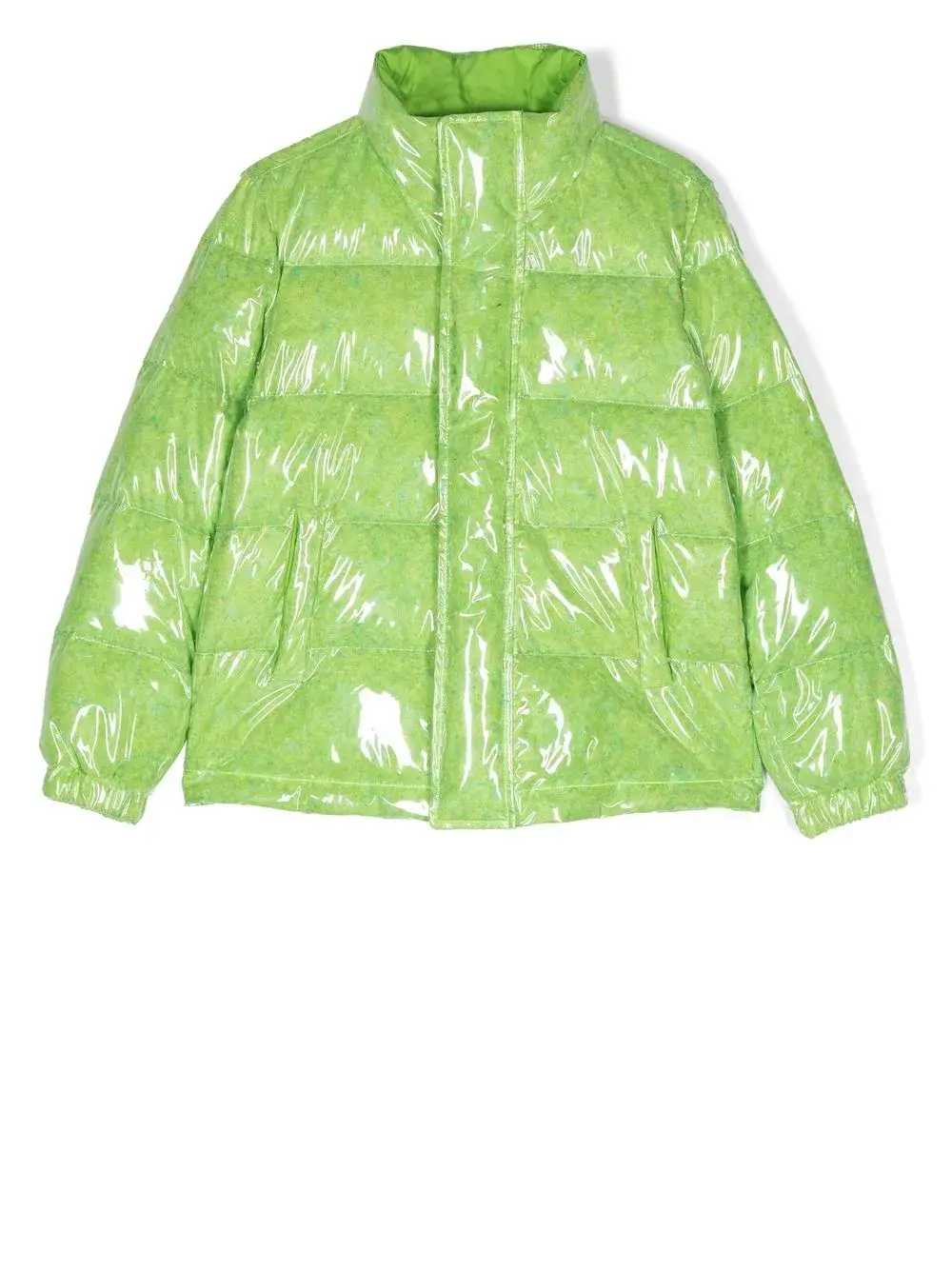 Салатовый, наполнитель из смеси пуха и пера, дутый материал, высокий воротник, потайная застежка спереди, прорезные карманы по бокам, длинные рукава и прямой подол