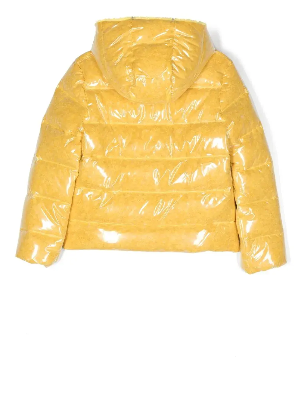 Желтый, наполнитель из смеси пуха и пера, лакированное покрытие, классический капюшон, застежка на молнии спереди, длинные рукава и прямой подол