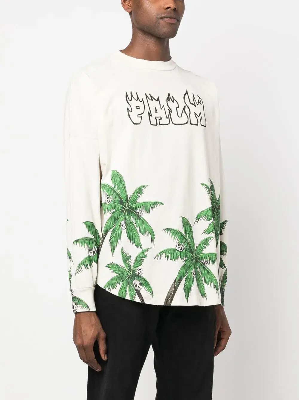 Кремовый, хлопок, принт с изображением пальм, круглый вырез, длинные рукава, принт с логотипом на груди, принт с логотипом сзади и прямой подол